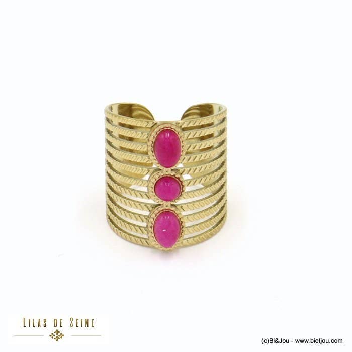 Middeleeuws ogende brede roestvrijstalen ring met ovale natuurlijke stenen cabochon voor dames, model 0422041. Deze stalen ring is open en licht verstelbaar. De breedte van het bovenstuk is 15 mm. Deze modieuze sieraden zijn gemaakt van natuurlijke steen; vorm, kleur en grootte kunnen verschillen. De ring bevat geen nikkel, lood of cadmium en is hypoallergeen, conform Europese regelgeving.