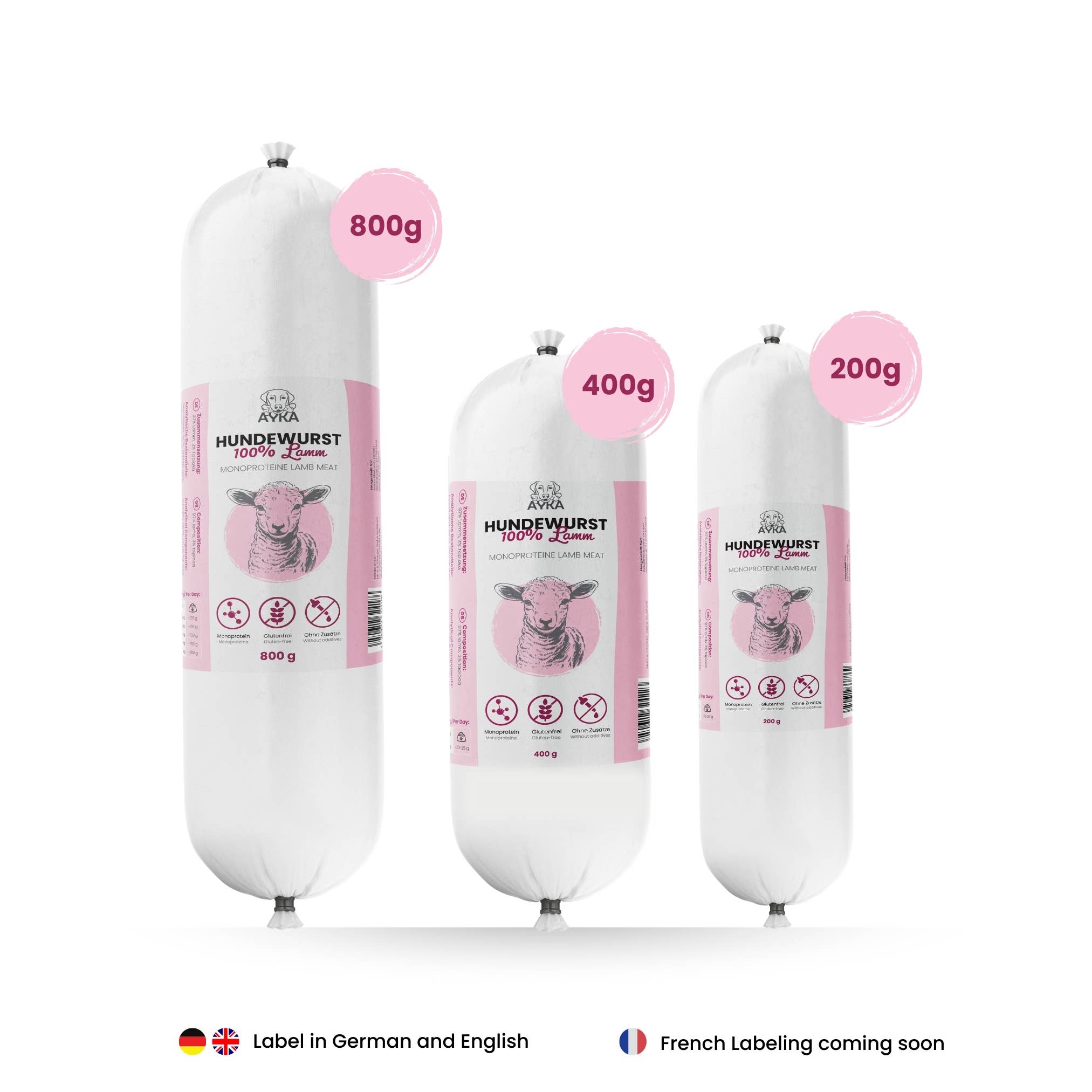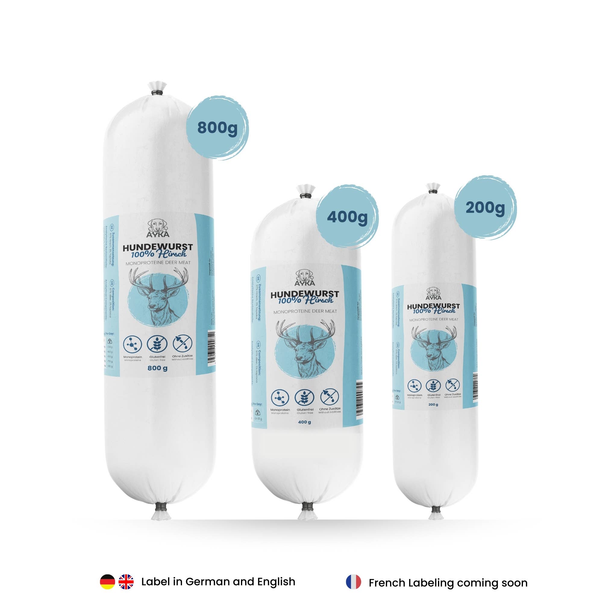 100% glutenvrij・100% graanvrij・100% suikervrij・Monoproteïne・Zonder kunstmatige geur- en kleurstoffen of toevoegingen Onze stevige AYKA hondensalami is een gezonde en smakelijke beloning voor honden. Gemaakt van hoogwaardig vlees met zachte verwerking om de belangrijke voedingsstoffen te behouden. De ideale alleskunner voor klanten die kwaliteit waarderen – of het nu gaat om training, als maaltijd op vakantie, of als aanvulling bij BARF, de AYKA hondensalami is veelzijdig inzetbaar. De verschillende vleessoorten maken het eenvoudig om de juiste hondensalami te vinden, ook voor honden met intoleranties of speciale diëten. Kies een etiketteringsoptie: 1. Ons huismerklabel AYKA – Het product wordt geleverd met een etiket in het Duits en Engels. 2. Zonder etiket – U ontvangt het product zonder etiket, alleen voorzien van een houdbaarheidsdatum en batchnummer. Het ontwerp en bevestiging van uw eigen etiket doet u zelf.