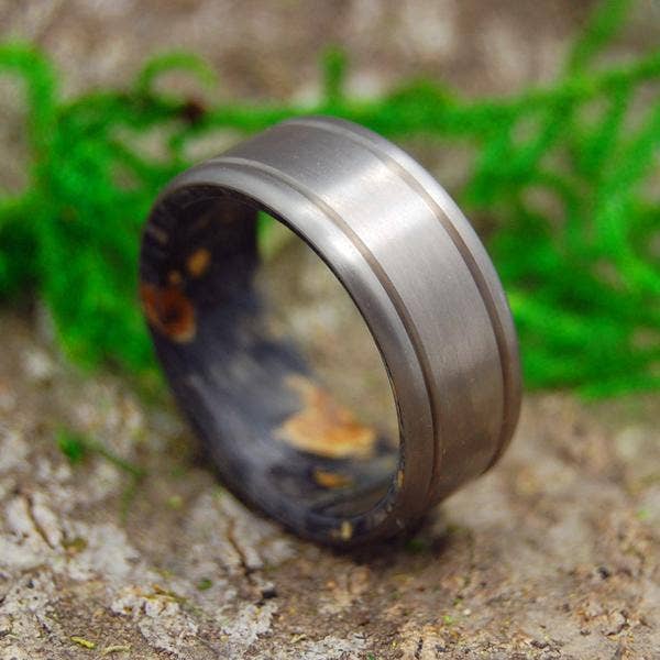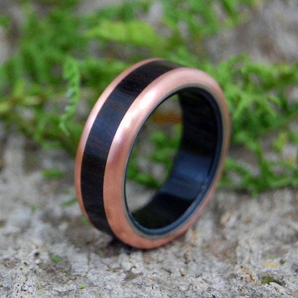Handgeslagen koperen herenringen van titanium. Onze nieuwe geslagen koperen trouwring voor heren is met de hand geslagen koper buiten gespeeld op helder, glanzend titanium. Kies je ringmaat en -breedte om aan de slag te gaan. Afgebeeld op 7,9 mm.