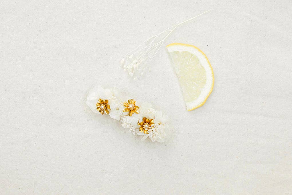 Deze Celeste dubbele kam, versierd met delicate ruscusbladeren en mini gipskruidbloemen die met de hand zijn gestabiliseerd en parelachtig gemaakt, zal je bruidskapsel subtiel laten stralen met iriserende accenten. Samenstelling: handgemaakte parelachtige gestabiliseerde bloemen (ruscus en mini gipskruid) Afmeting: één maat (ongeveer 15 cm) Houdbaarheid: de bloemen in deze kam zijn voor altijd. Opslagadvies: bescherm tegen zonlicht, warmte en vocht. Levering: 5 dagen na bestelling