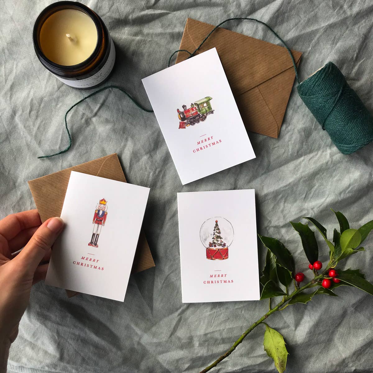 Gedrukt in het VK op glad dik karton voor een prachtige luxueuze textuur. In combinatie met een bruine ingepakte envelop. De gevouwen kaart is A7 Vintage Toys, Cosy, kinder-, kinder-, kitsch, aquarelartiest Festive Seasonal Vintage Traditional Country; cottage-core; rustiek interieur; strandhuis; rode en groene esthetiek; winter; sneeuwbol, trein, notenkraker