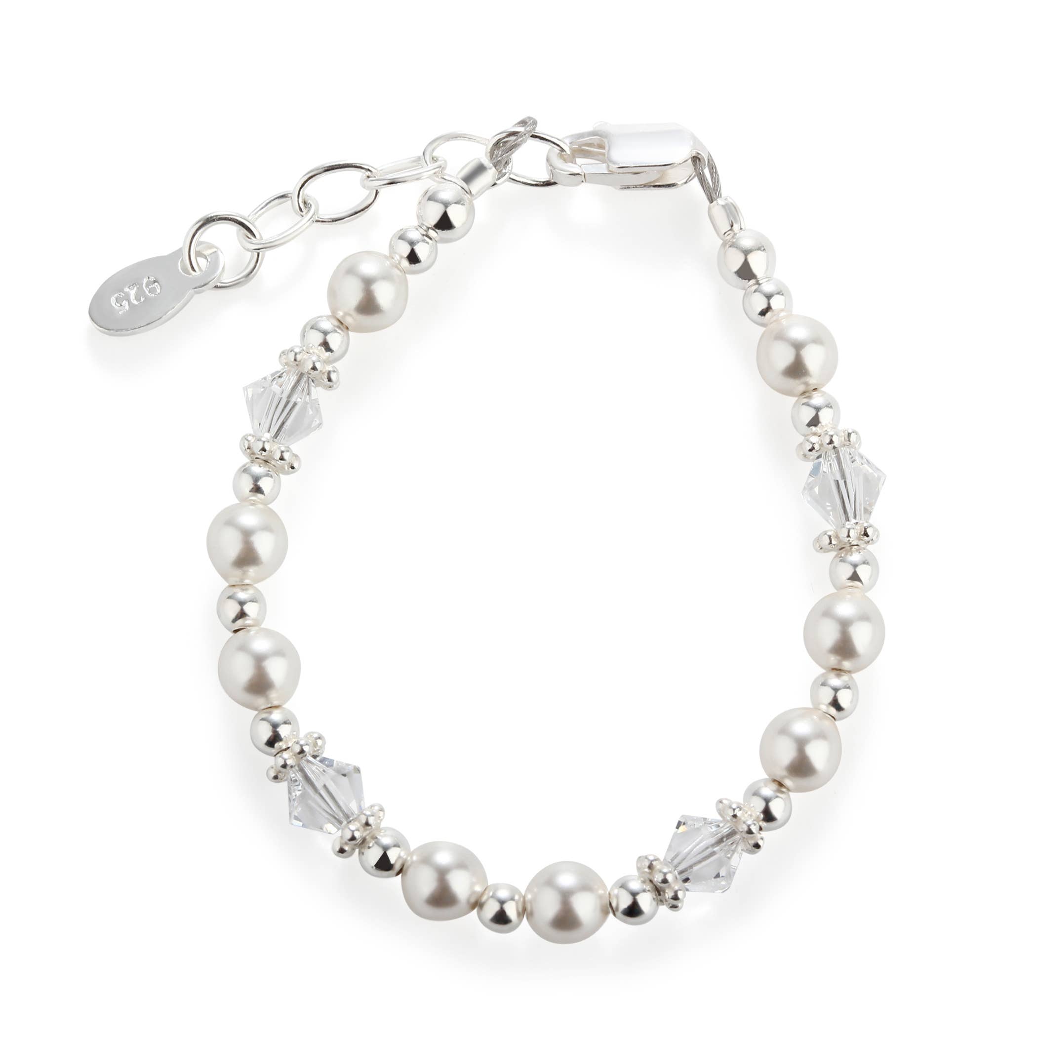 Prachtige sterling zilveren armband gemaakt van roze hoogwaardige Oostenrijkse gesimuleerde parels en sprankelende kristallen - perfect roze! Dit ziet er prachtig uit voor bloemenmeisjes of Jr. Bridesmaid and is een tijdloos aandenken dat een perfect babycadeau, bloemenmeisje of haar eerste parels is! Elke armband heeft een verlengketting, dus als het kind groter wordt, ga je gewoon naar de volgende schakel voor een perfecte pasvorm. Deze armband is verkrijgbaar in drie maten en is geweldig voor baby's, peuters en kinderen. Met de hand gemaakt in de VS