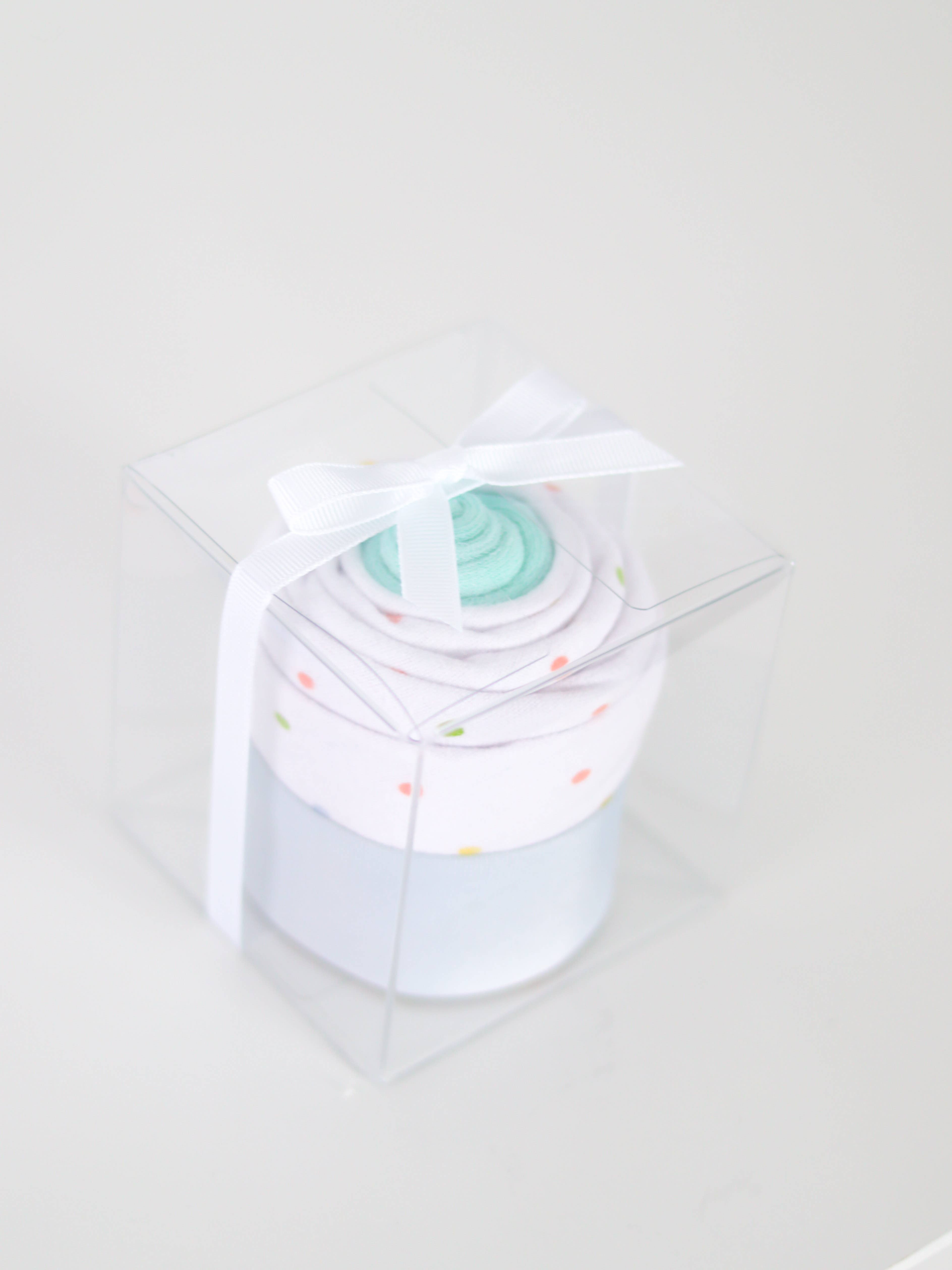 Enkele cupcakes zijn het perfecte accessoire voor een babycadeau! Ingrediënten: 1 paar sokken 1 katoenen flanellen opvangdeken (30x30 inch) Enkele cupcakes worden geleverd in een doorzichtige doos met daarop een strik. De doos is 3,5" breed en 3,5" hoog.