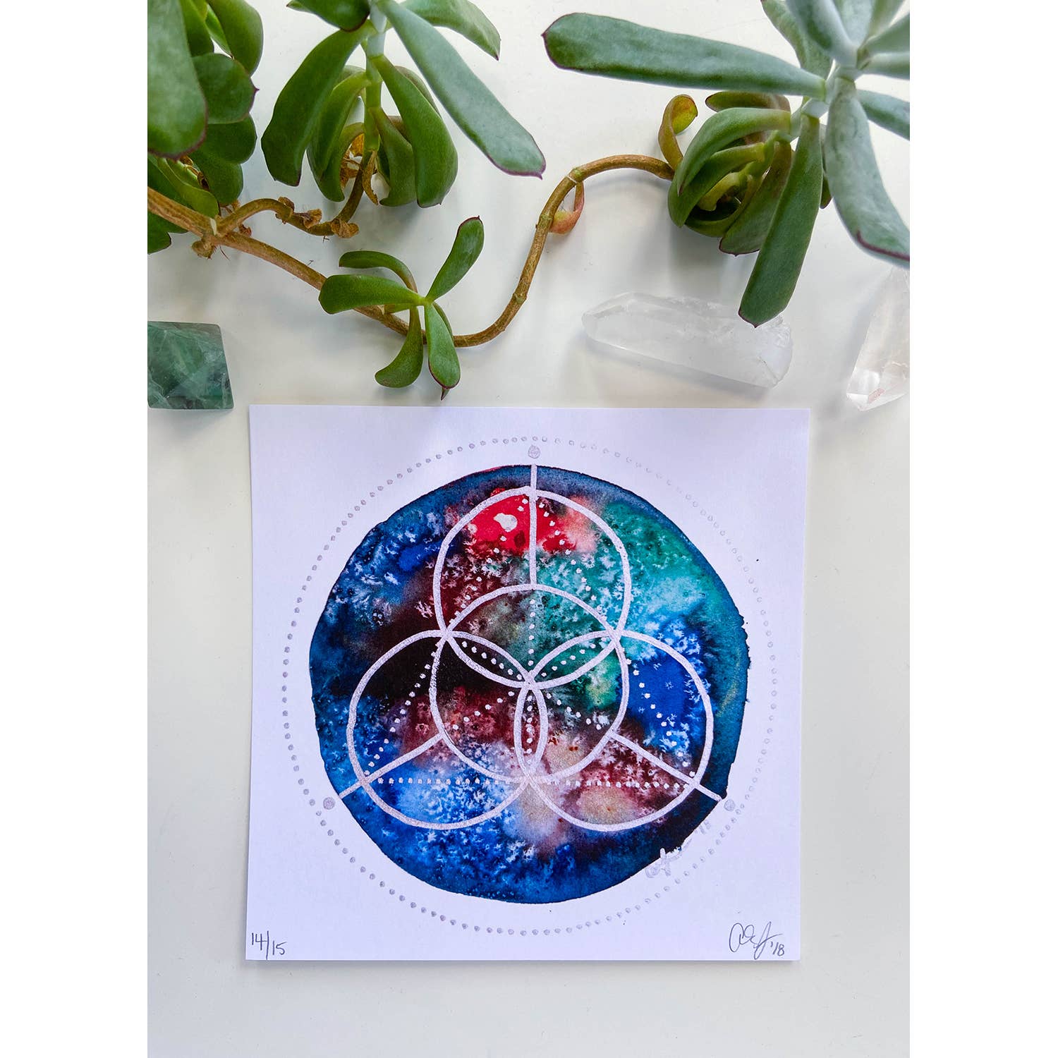 Archiefdruk op aquarelpapier, verpakt in een doorzichtige zak met witte 4-laags achterkant en een artiestensticker. Groen, geel, zwart.