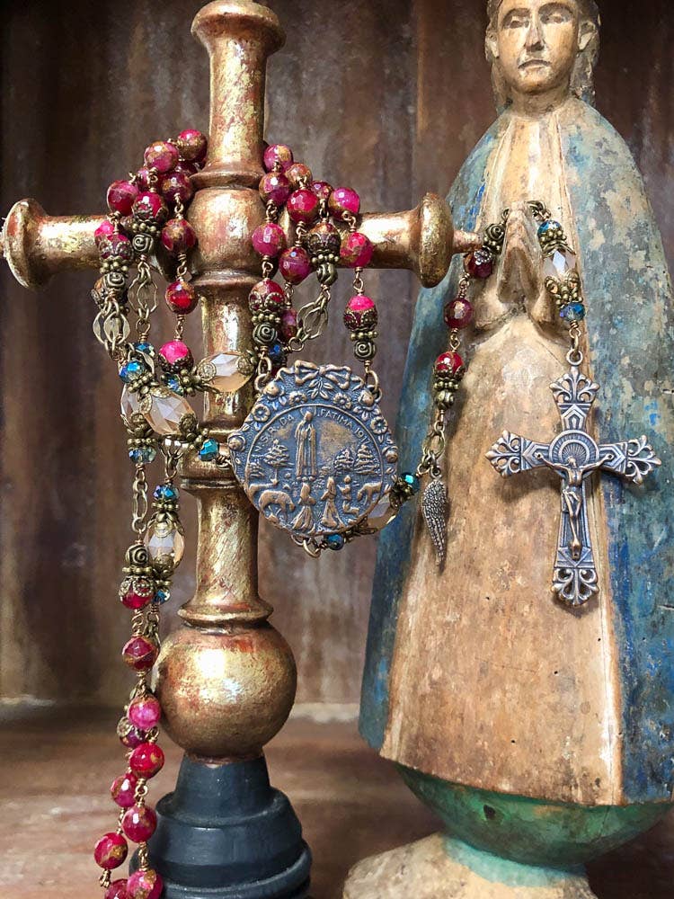 KRALEN: 8mm gefacetteerde zwarte gestreepte agaten met groene jaspis accentstenen. CENTERPIECE MEDAILLES: Dit is een prachtig massief bronzen handgegoten dubbelzijdig ontwerp met een schild met Onze-Lieve-Vrouw van Pompei die rozenkransen overhandigt aan St. Dominic en St Catherine van Sienna. Op de achterkant van de medaille staat het heilige kruis met twee gekruiste armen: de rechterhand van Christus en de linkerhand van de mens. Een symbool van Christus' liefde en de reactie van de mens op Gods liefde. Een Latijnse inscriptie luidt: „Instaurare amnia in Christo per Mariam”, wat zich vertaalt naar: „Herstel alle dingen in Christus door Maria.” ONZE VADERSECTIES: We hebben de Onze Vader kralen vervangen door massief bronzen middeleeuwse kruisen. CRUCIFIX: Massief brons en uitgebreid ontwerp met een Fleur-De-Lys (Lelies) aan elk uiteinde van het kruis die De Heilige Drie-eenheid en de eeuwige zuiverheid Onze Gezegende Moeder Maria voorstelt.