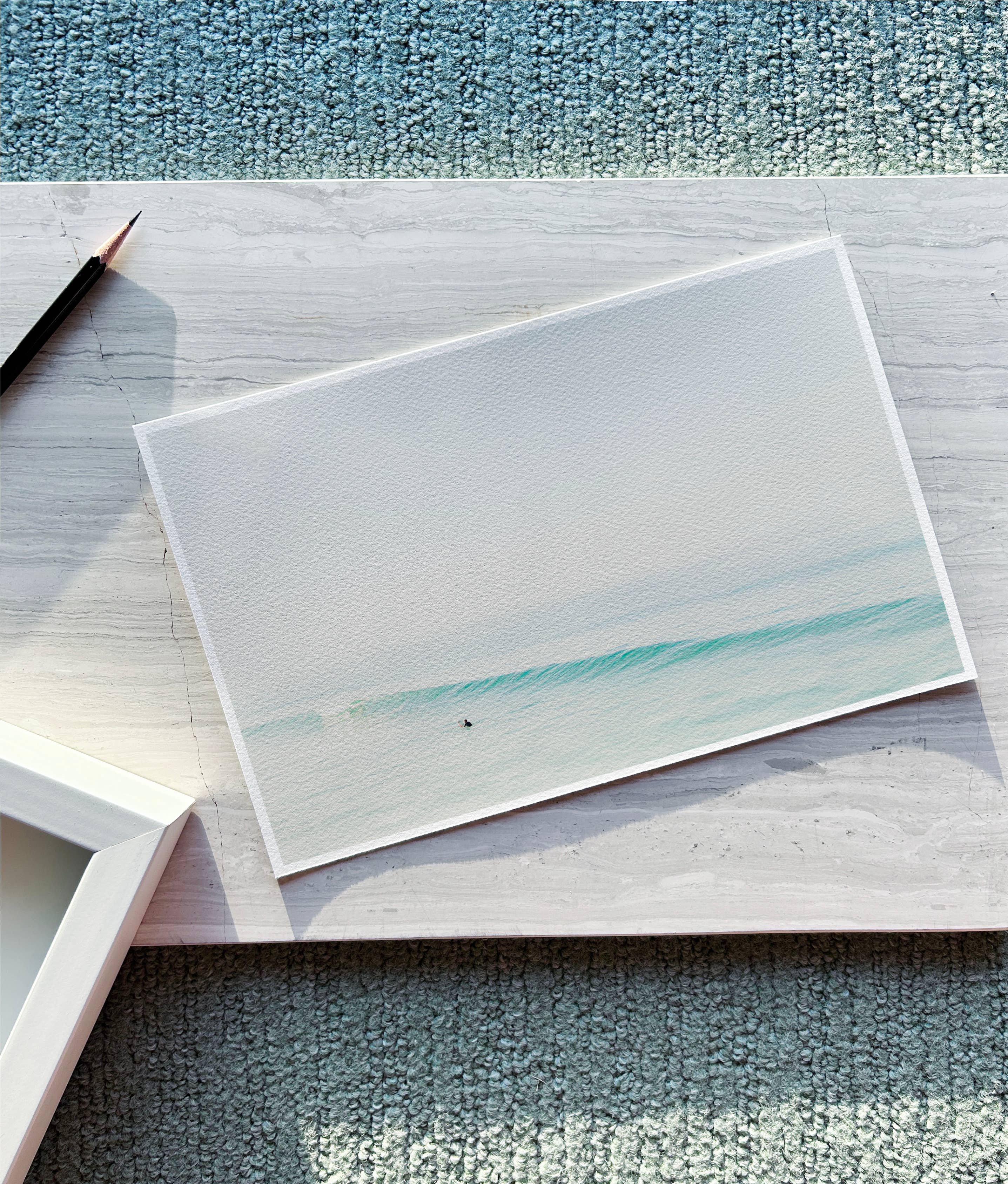 Leg de sfeer van een dag aan de kust vast met deze artistieke foto van een serene blauwe oceaan, zachte wolken en een vrouw die in de branding waadt nabij San Clemente, CA. Een unieke en originele 8x12" of 16x24" archief pigmentprint op fijn kunstpapier met een witte rand.