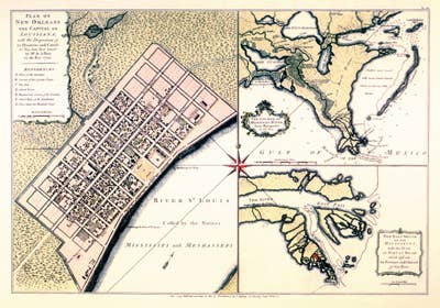 15 1/4" x 18 1/4". Châtelain's kaart van het Franse domein in Noord-Amerika is een versie met één vel van de meerplaatgravure door Nicolas de Fer die een jaar eerder werd gepubliceerd. Het bevat een fijn invoegplan en uitzicht op Quebec en, bovenaan, een uitbreiding van het gebied van de rivier de Mississippi naar Pensacola Bay. Indiase dorpen, dieren, schepen en zeemonsters voegen een decoratieve aantrekkingskracht toe aan deze prachtig gekleurde en zeer gedetailleerde kaart. Gekleurd papier met tekstgewicht.