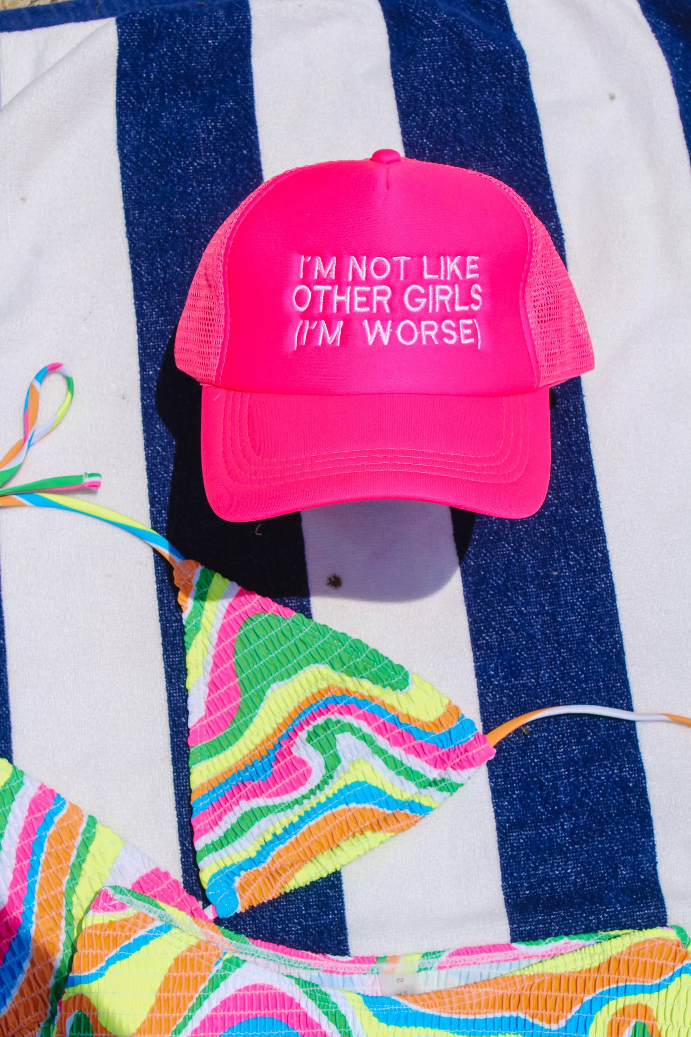 De kleur van hoed en draad kan enigszins variƫren, afhankelijk van de verlichting, schermen of filters. Kleur: Neonroze/wit IK BEN HET NIET, JIJ BENT HET, geborduurd in een neonroze draad 100% polyester Comfortabele uniseks pasvorm; ƩƩn maat. Kroon: 22 Deze worden op aanvraag gemaakt, houd rekening met een verzendtijd van maximaal 14 werkdagen