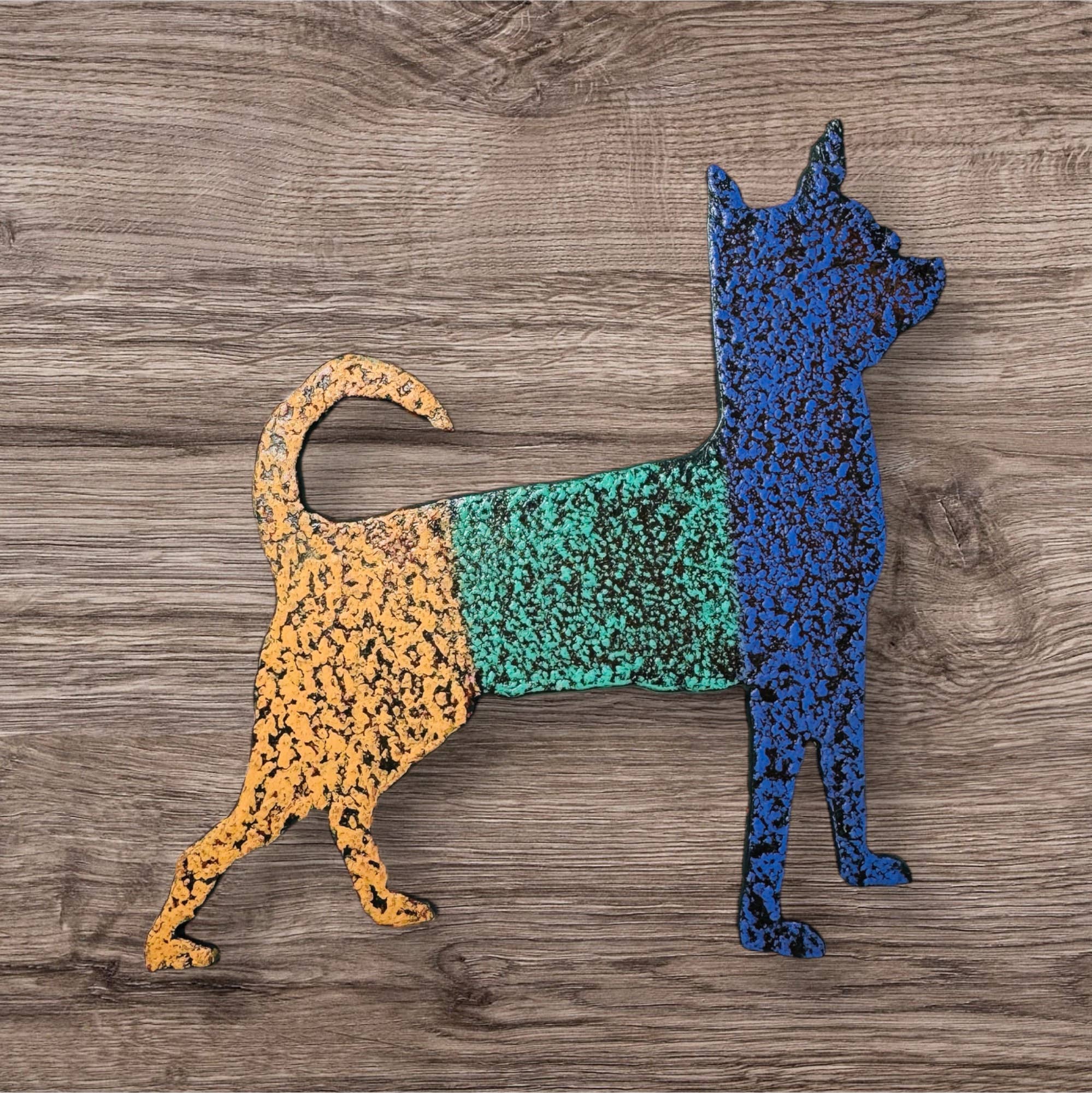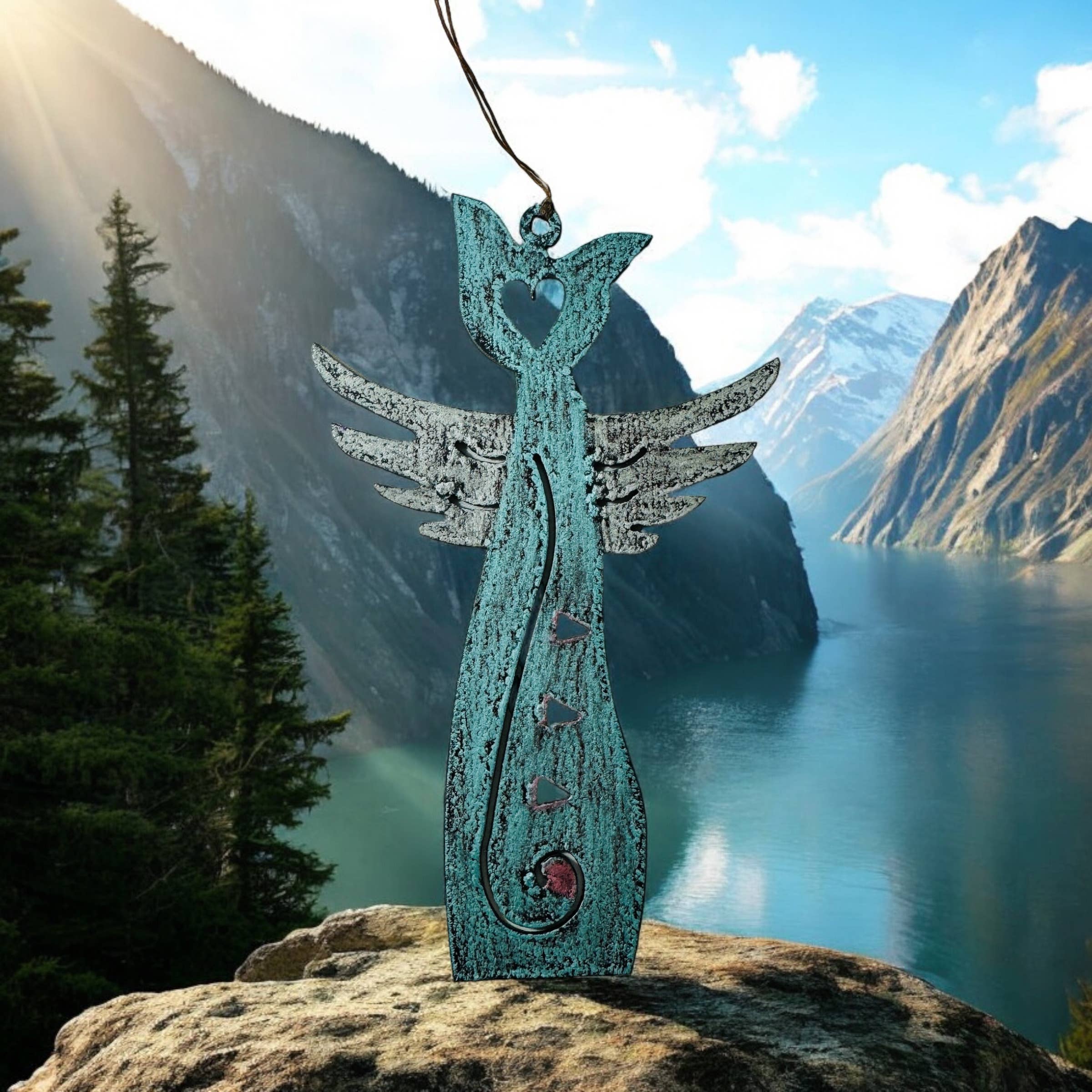10" hoge, kleurrijk geverfde metalen bel die ideaal is voor gebruik binnen of buiten. De bel, die een leuk klokgeluid heeft, kan aan een deurknop of boom hangen. Gemaakt van gerecyclede metalen die door de zon zijn verweerd. Gemaakt in de VS. Echte bel die rinkelt. Deze zijn in tegenstelling tot andere erg groot gemaakt. Makkelijk te verkopen. Metalen poot met vleugels.