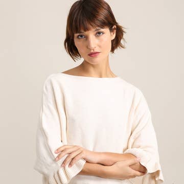 Getailleerde bolero trui met lange mouwen. Rayon spandex mix. Ulra zachte geborstelde hacci trui en lichtgewicht. Perfect voor gelaagdheid en het hele jaar door te dragen. Koud handwas; plat drogen. Gemaakt in San Francisco.