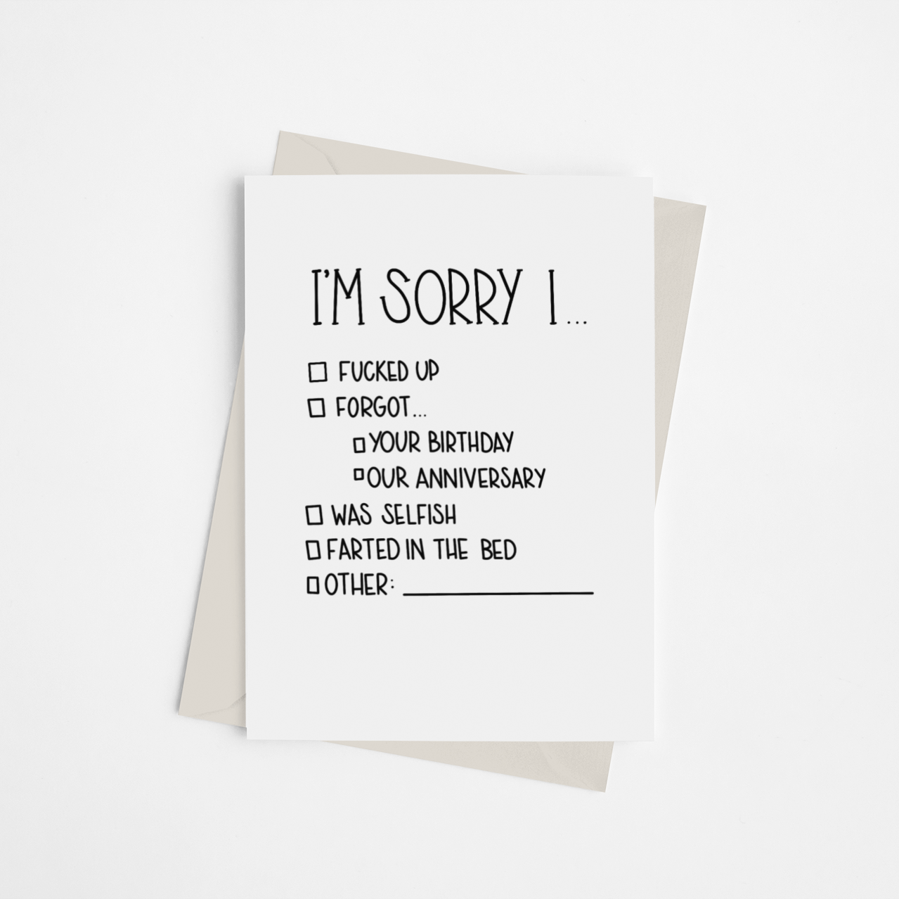 „Het spijt me dat ik het verknald heb” kaarten zijn goed om bij de hand te houden voor het geval je, weet je, verkloot. De kleine lettertjes: Alle ontwerpen zijn eigendom van Black Cat Bazaar. Gedrukt op 65+lb kaartvoorraad, verpakt in biologisch afbreekbaar cellofaan en bevat een bijpassende envelop. Blanco aan de binnenkant.