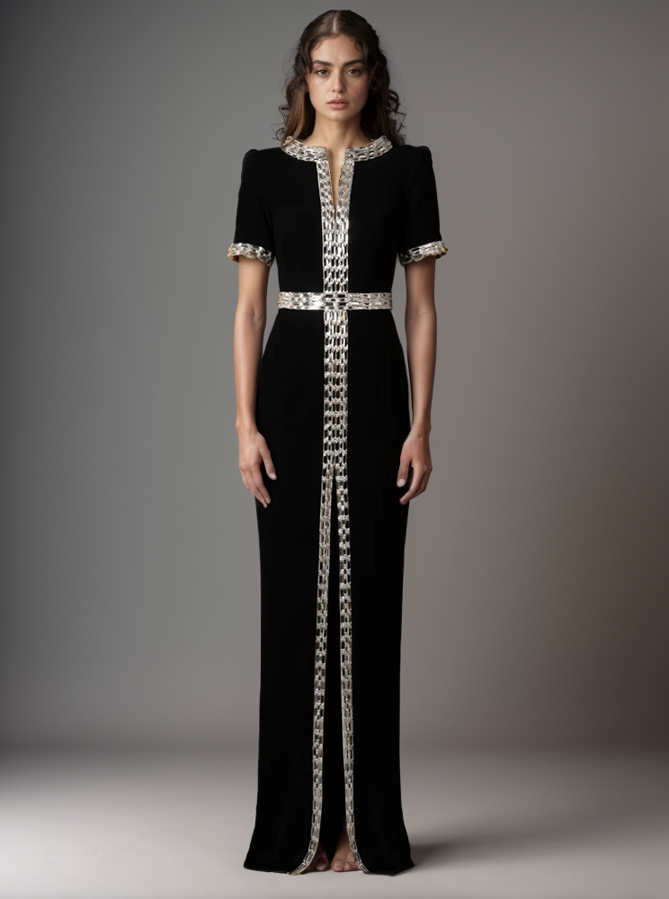 Onthul de essentie van elegantie met onze „Sophisticated Flare-Cuff Black Gown”, een kledingstuk dat de combinatie van traditie en moderniteit belichaamt. Deze jurk over de volledige lengte is zorgvuldig gemaakt om het figuur te contouren en aan te vullen, wat zorgt voor een statige presentatie in elke omgeving. De lange mouwen, met hun kenmerkende wijd uitlopende manchetten, zorgen voor een gewaagd stijlstatement, terwijl de bijbehorende ingewikkelde ketting een vleugje weelde toevoegt. Deze jurk is ideaal voor luxe evenementen en gala's en is een bewijs van tijdloze schoonheid en onuitgesproken allure, en biedt een sfeer van verfijning die fascineert en betovert. Met zijn naadloze mix van comfort en elegantie is deze jurk een uitstekende keuze voor de veeleisende klantenkring van uw online groothandel. Maak een blijvende indruk met dit prachtige stuk dat boekdelen spreekt zonder een woord te zeggen.
