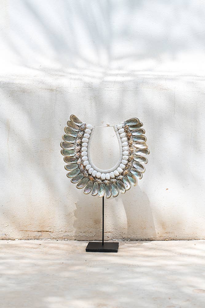Decoratieve ketting, met de hand in macramé genaaid, met vier rijen verschillende schelpen en afgewerkt met roze ganzenveren.