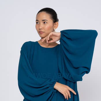 Jazz abaya-jurk met bijpassende sjaal, ongeveer 147 cm lang, verkrijgbaar van maat 36 tot 50. Gemaakt van 100% polyester. Deze damesabaya heeft lange, brede mouwen met elastiek en is ontworpen voor een comfortabele pasvorm.