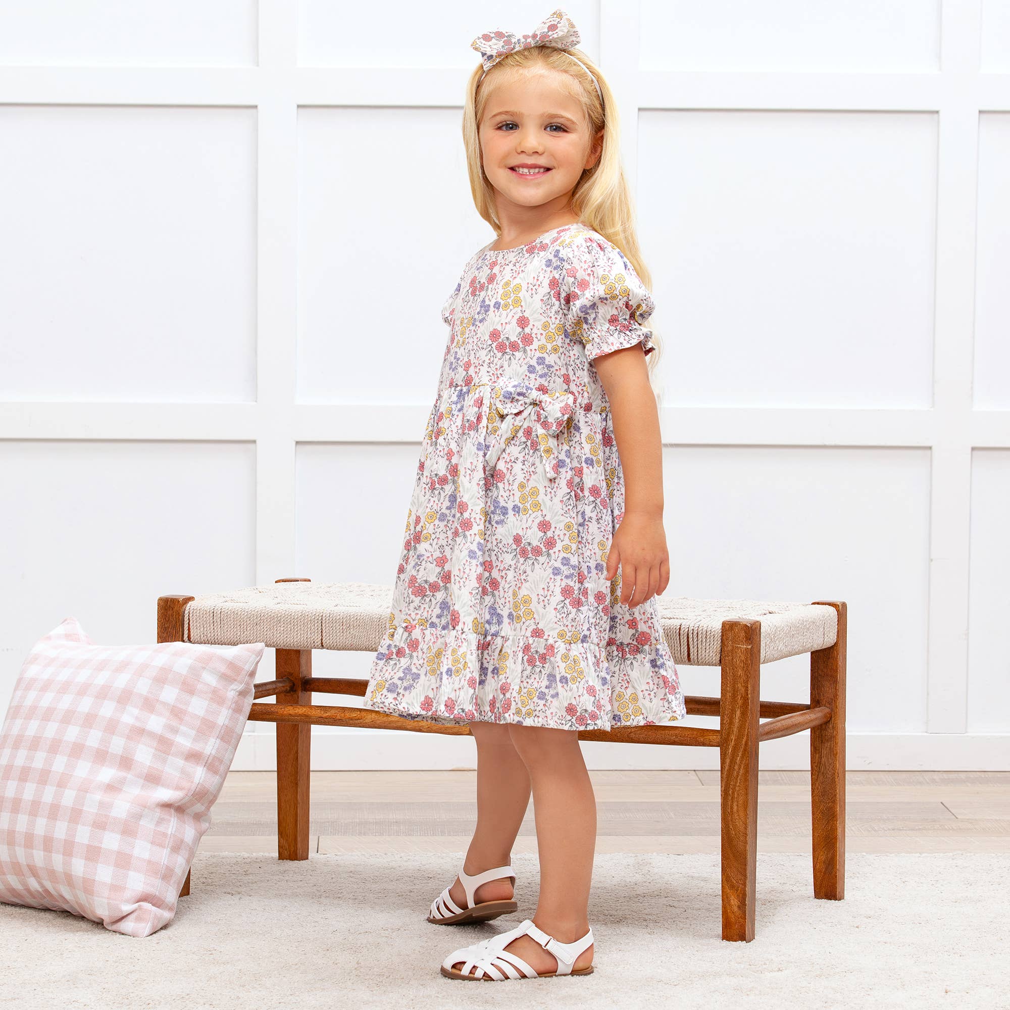 Wikkel je kleintje in de elegantie van onze 100% katoenen jurk met prachtige ajourborduursels. Ontworpen met romantische pofmouwen en een empire taille, en voorzien van een zachte katoenen voering voor extra comfort. De knopen aan de achterkant maken verschonen eenvoudig. Handwas warm, plat laten drogen aan de lucht. Uit de Truffles Ruffles Capsule Collectie met prachtige stijlen voor meisjes van 0-6 jaar.