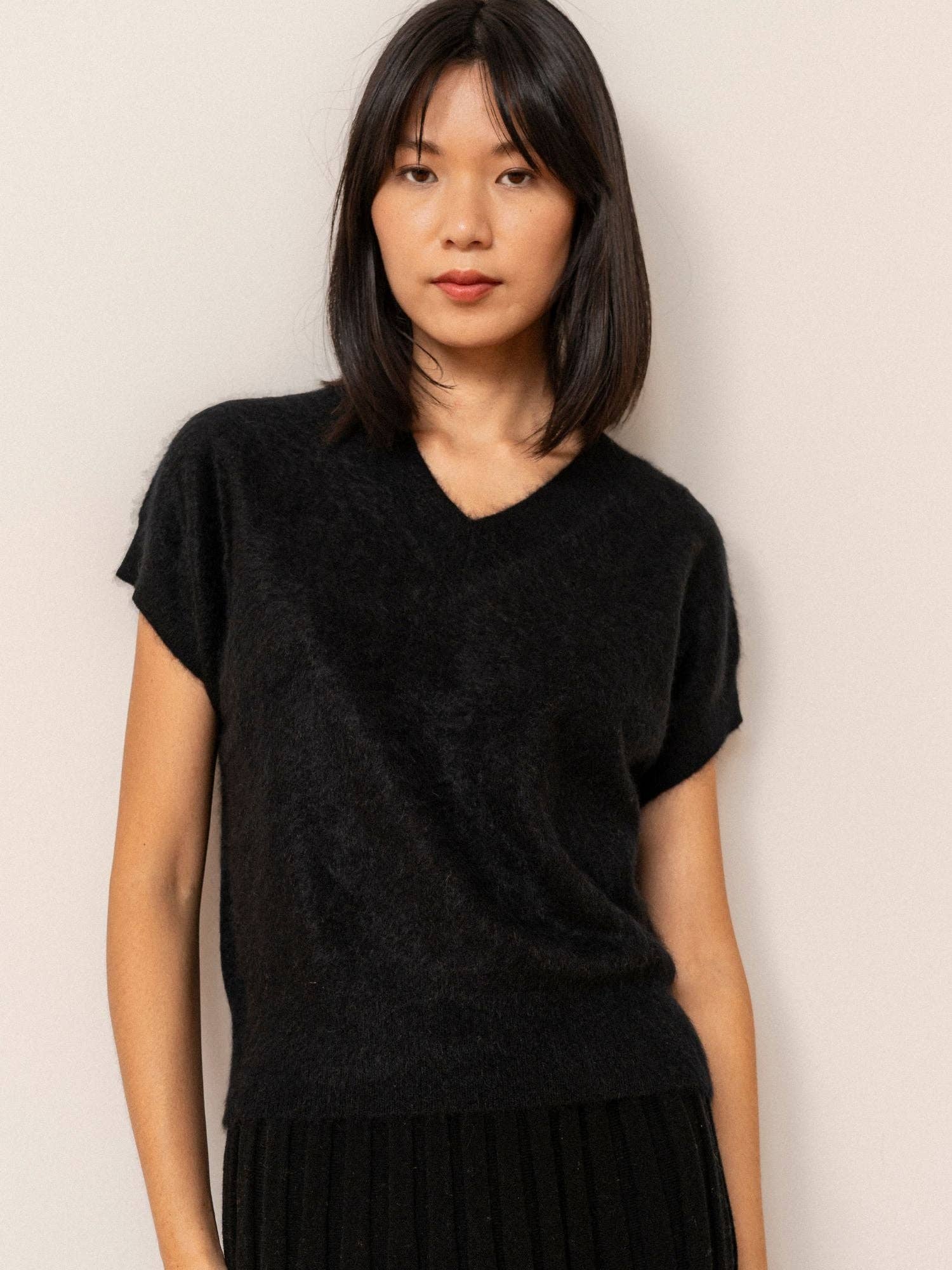 Gewassen Korte Mouw V-Hals Top Met Hoge Lage Zoom