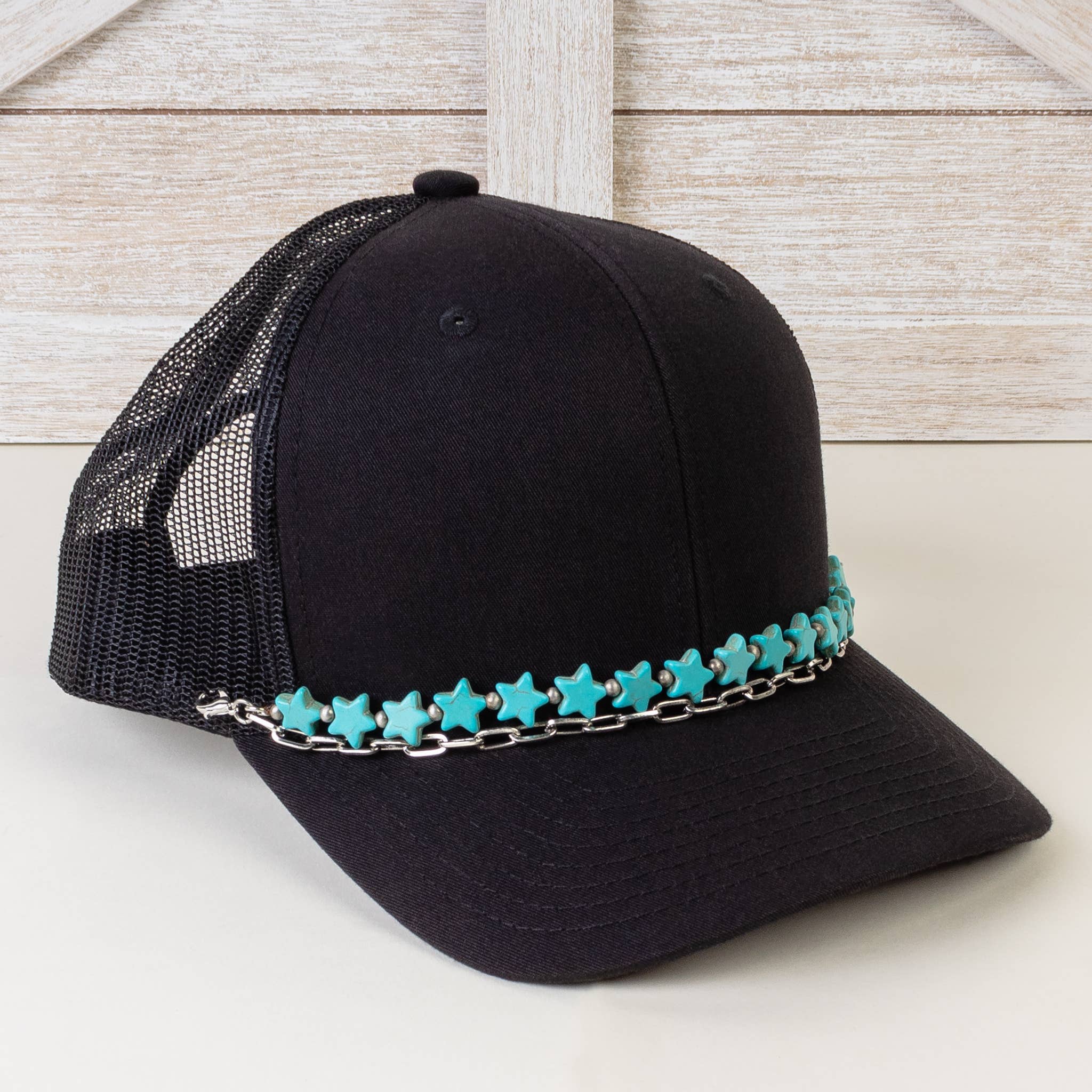 Squash Blossom Trucker Pet Ketting Turkoois Stenen Details Kreeftsluitingen aan elke kant die kunnen worden bevestigd aan petten met netachtige achterkant Eén maat Trucker Pet Niet Inbegrepen Door: EMMA