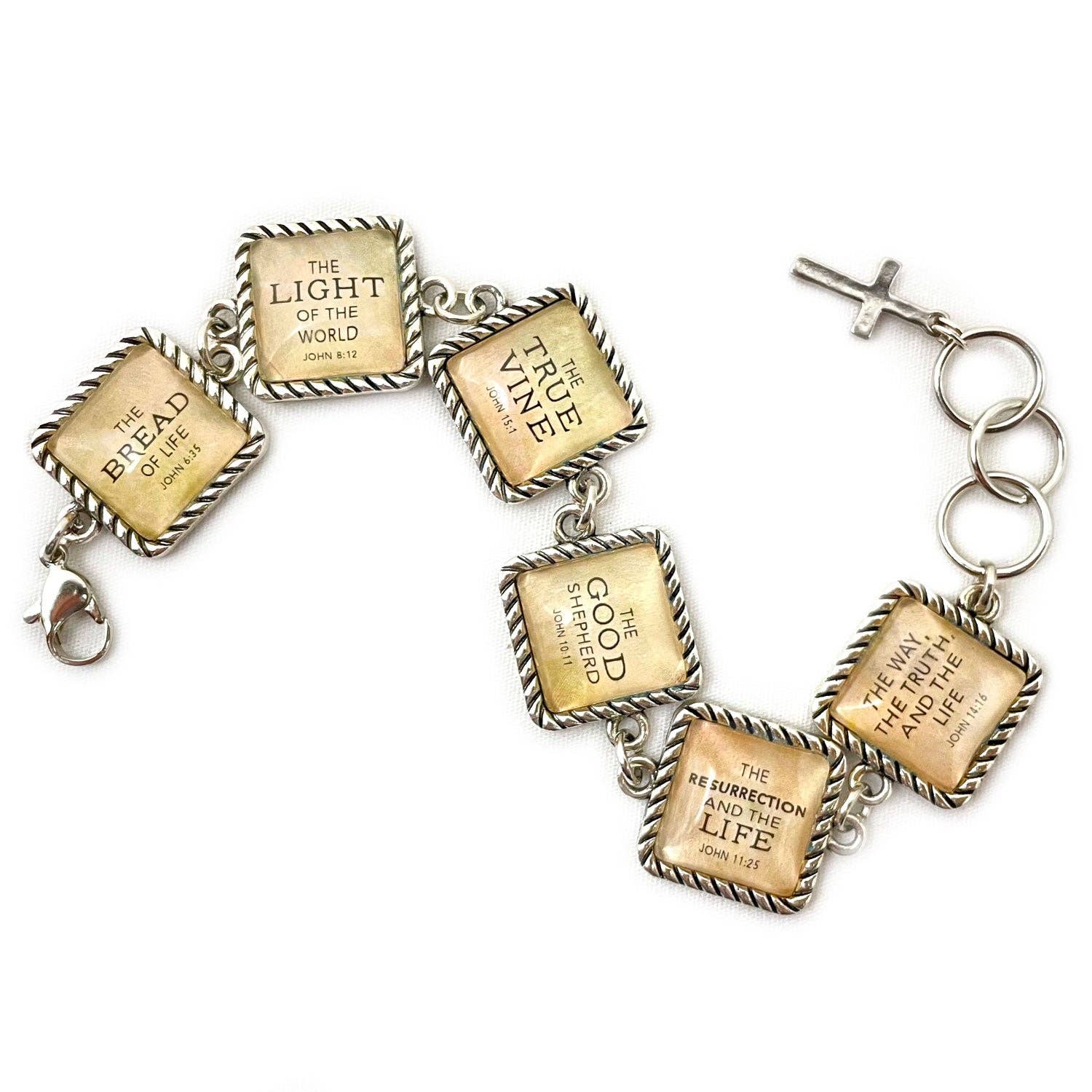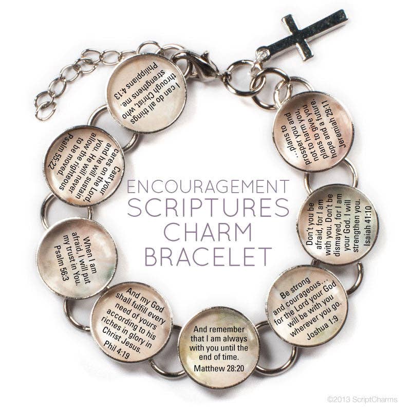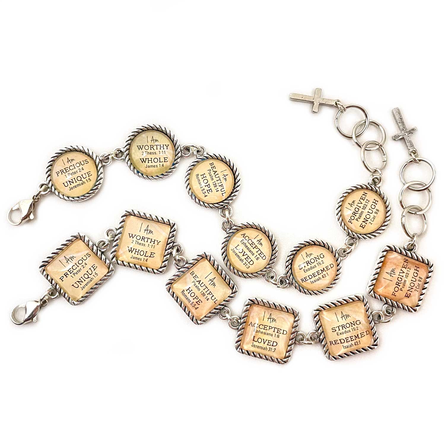 Ik ben een vrouw van God Verlost door Jezus Christus Geliefd, achtervolgd en gekozen Uitgerust met woorden van het leven Gekleed in kracht en waardigheid Hier & nu in opdracht Geschonken door de Geest Vergeven en niet geconsolideerd Gezegend is zij die geloofde Ze wordt herinnerd aan wie ze is elke keer dat ze naar haar prachtige armband kijkt met deze christelijke affirmaties op zes glazen bedels. Kies voor ronde of vierkante instellingen in antiek zilver, met een draairandontwerp. Elk sieraad van ScriptCharms is handgemaakt op bestelling. * Zes ronde of vierkante instellingen met draairandontwerp * 16 mm glazen bedels * Grote karabijnsluiting * 7-1/2" lengte met drie-ring extender om de maat aan te passen tot 8-3/4" * Neutrale/veelkleurige achtergrond * Antiek zilver * Bungelende kruis charme * Loodvrij, nikkelvrij