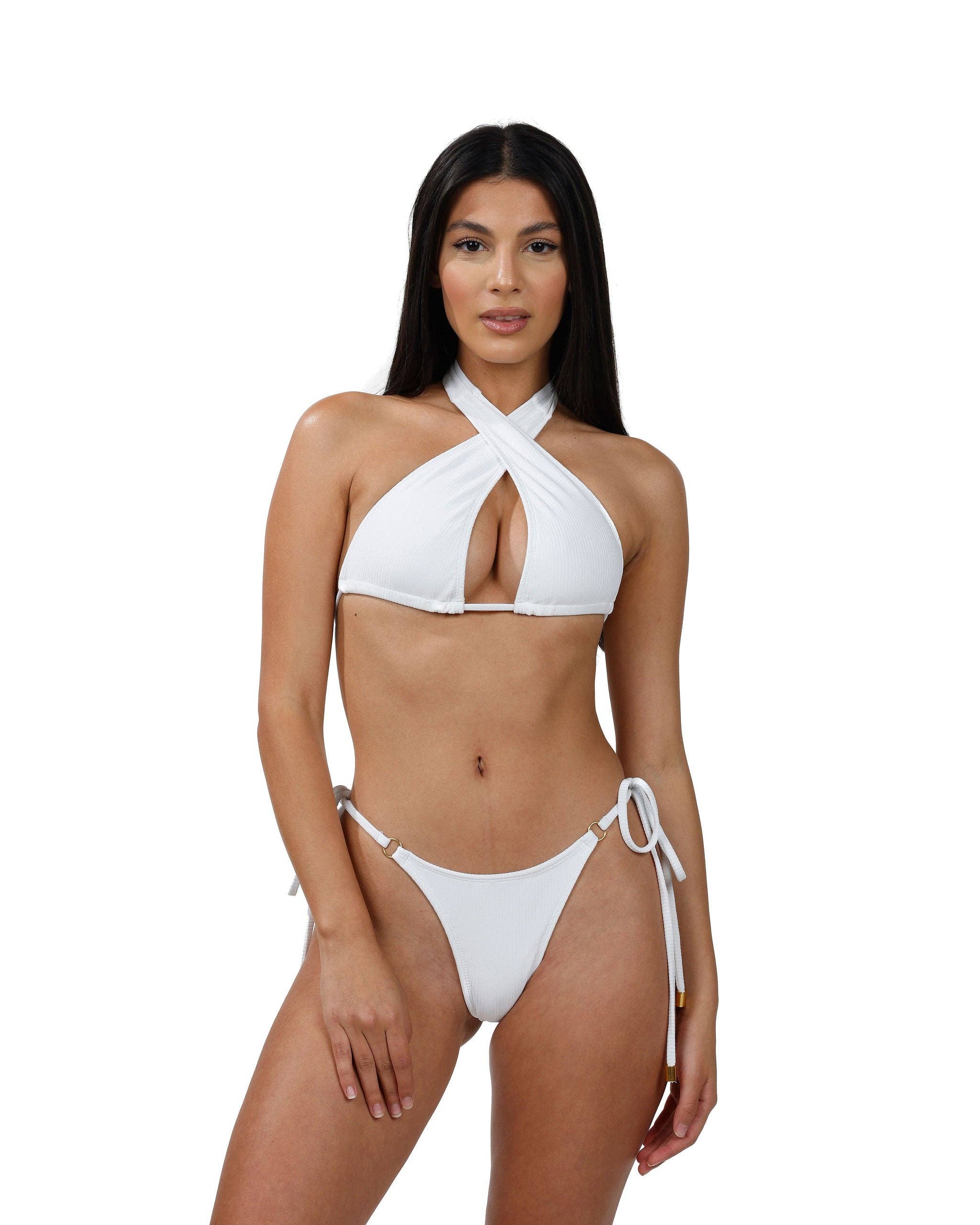 De Chicas die het krijgen, snappen het. Ons Boca Chica bikinibroekje is een no-brainer in elke zwemgarderobe. Ze biedt een brutaalere dekking en is bedoeld om boven of onder de heupen te worden gedragen voor een volledig flatterend effect - jij beslist. Gemaakt van onze luxe geribbelde stof. KENMERKEN: * Hoog uitgesneden been * Details met ruches * Brutale dekking MODEL MAAT & PASVORM Victoria draagt maat Small Hoogte: 5' 7" Buste: 32" Taille 24" Heupen: 36" MATERIALEN EN VERZORGING Gemaakt in Miami, FL 85% nylon/ 15% spandex Handwas, alleen ophangen