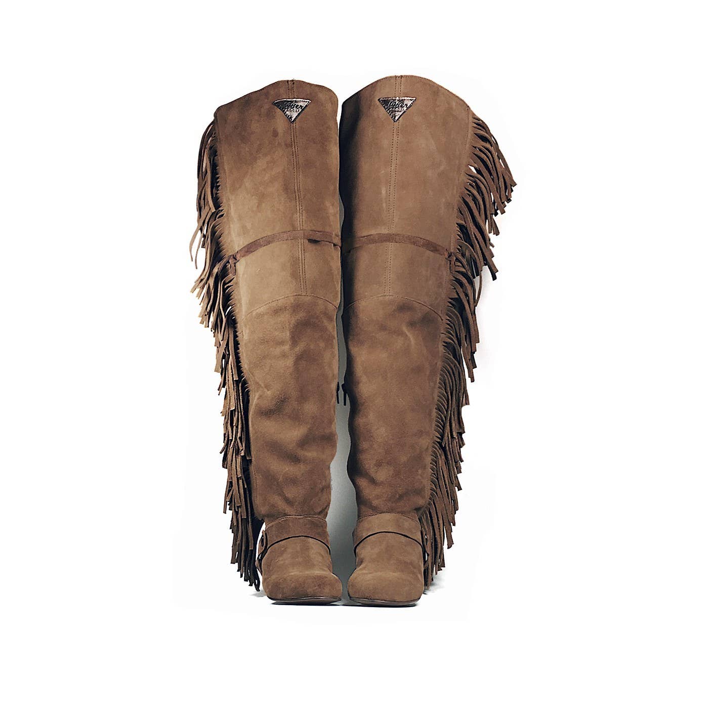Espadrille met suède bandjes en twee sluitingen rondom de enkel. Voorzien van een gesp en drukknop met bewerkte details. De bandjes zijn versierd met zilverkleurige studs en het centrale LAYER BOOTS logo. De sleehak is 10 cm hoog met een voorkant plateau van 3 cm en een gevoerde leren binnenzool voor extra comfort.