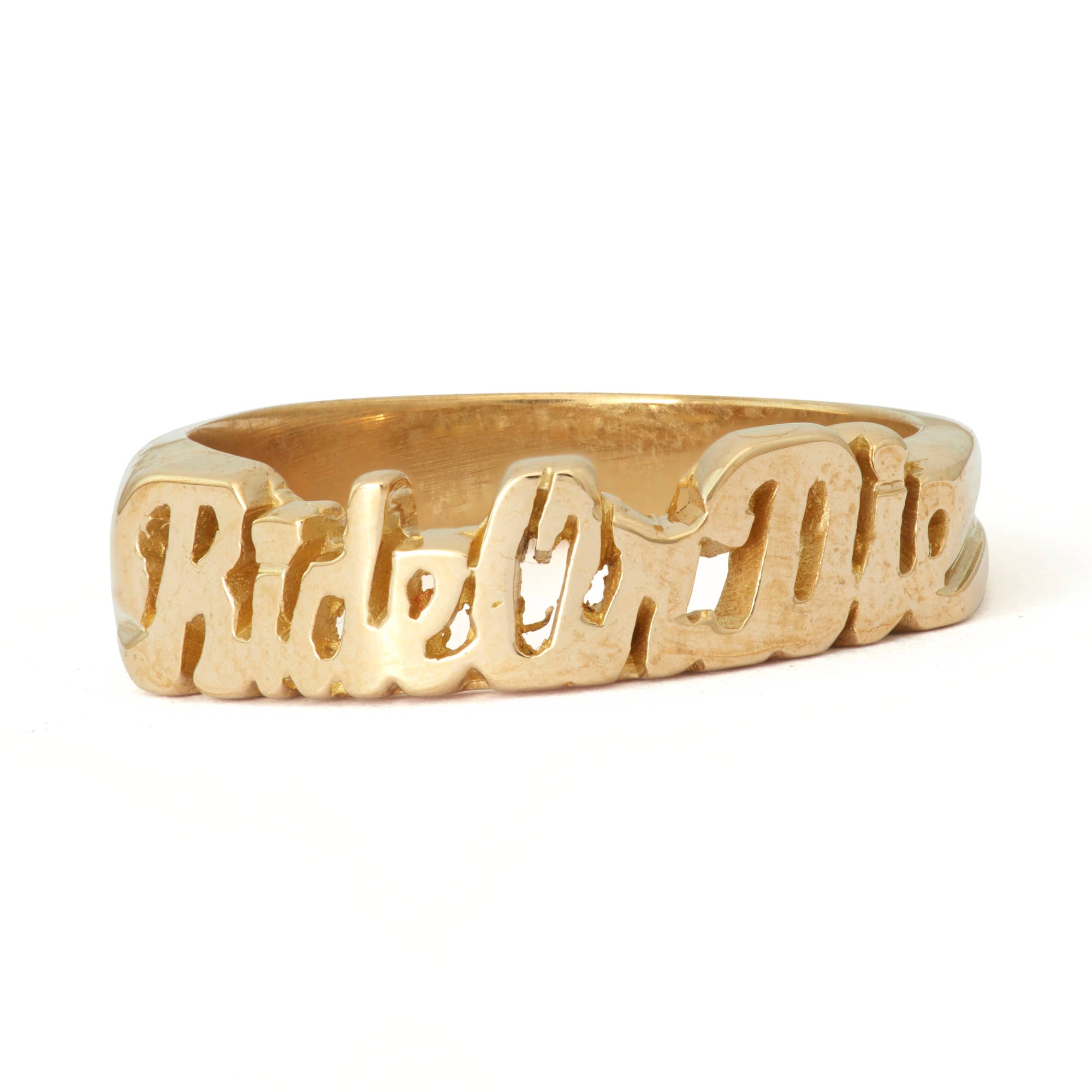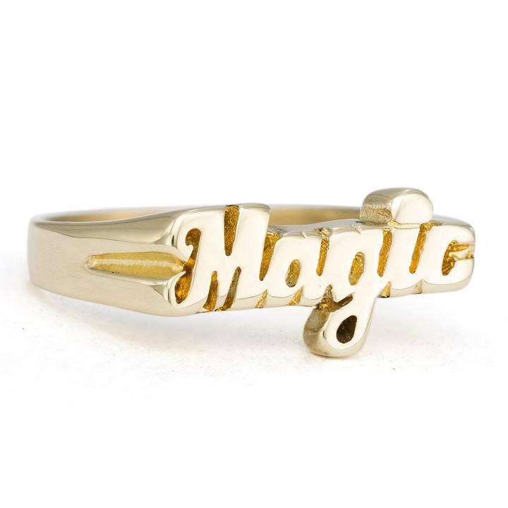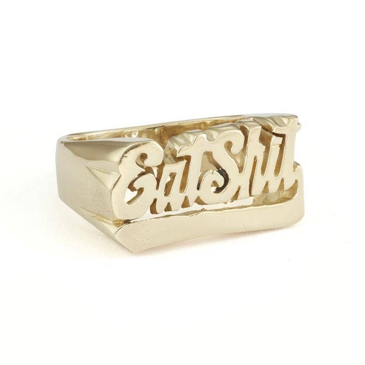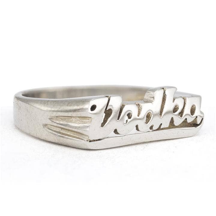 Snash Jewelry naambordringen zijn verkrijgbaar in de maten 5-9. Messing ringen zijn ongecoat, waardoor de klant opnieuw kan polijsten. Het vermijden van water, zware lotions, chloor, enz., Verlengt de originele gepolijste glans. Het reinigen van de ring met een sieradenpolijstdoek zal de glans herstellen als er aanslag optreedt.
