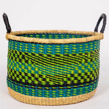Afrikaanse marktmand - de Ghana Bolga mand is ook perfect als geschenkmand! Deze manden hebben een traditionele vorm uit de Bolgatanga regio in Noord-Ghana. Ambachtslieden uit deze regio vlechten deze mooie en duurzame manden van dik, sterk olifantengras. De Bolga mand is wereldwijd populair bij kinderen, milieubewuste shoppers, drukke moeders en picknickplanners. Met de hand geweven in Ghana van lokaal olifantengras. Elke mand is uniek in patroon en de met leer omwikkelde handgreep zorgt voor extra stevigheid. Deze bijzonder stevige en veelzijdige mand is ideaal als woonaccessoire, plantenpot, speelgoedmand, paasmand of als markttas. Let op: om verzendkosten en verpakkingsmateriaal te beperken worden deze manden plat gevouwen verzonden. Dit beschadigt ze niet, en bijgesloten instructies laten zien hoe je ze weer in vorm brengt. Nat maken helpt het hervormen; ze veren met een beetje hulp vanzelf terug naar de oorspronkelijke vorm.
