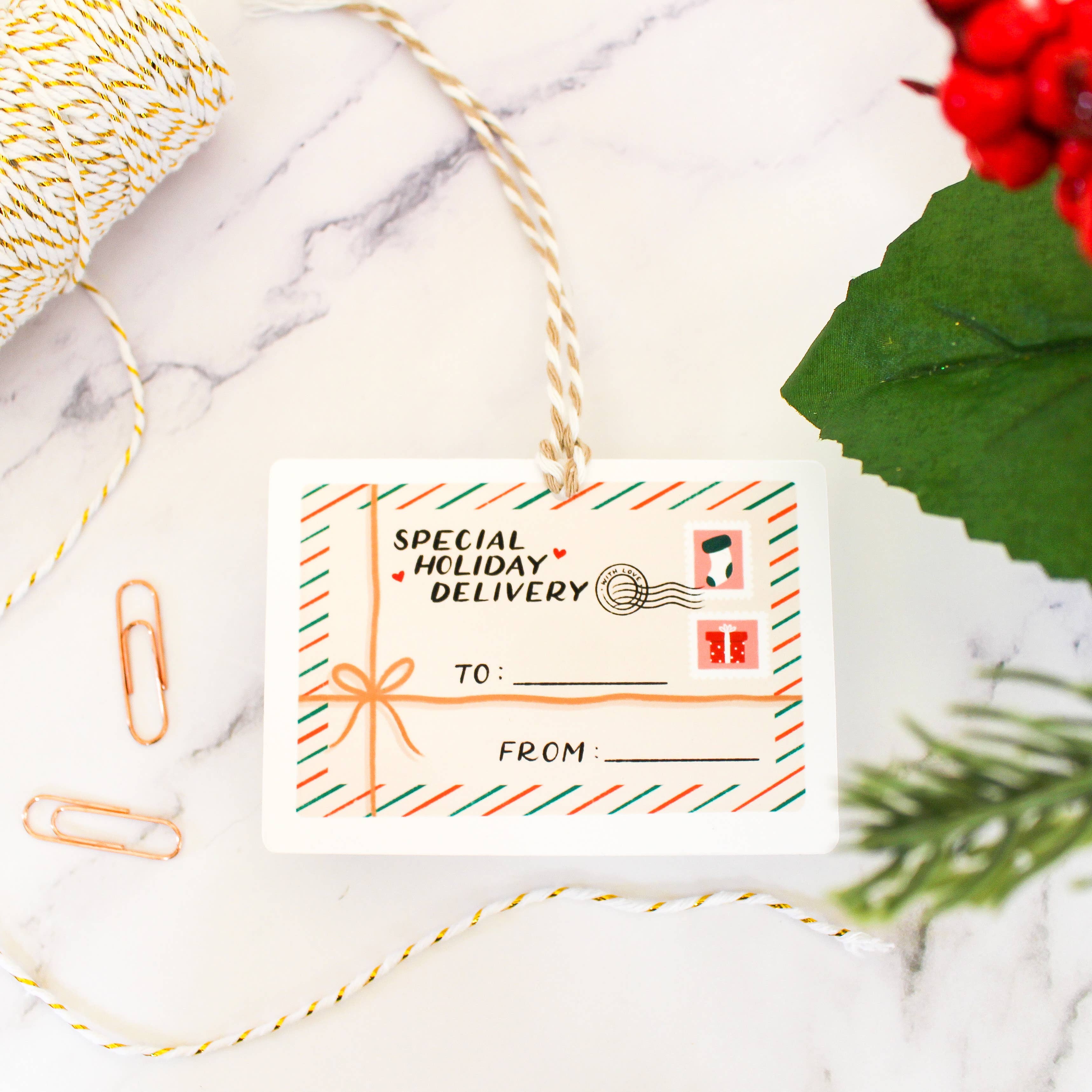 Verspreid vreugde deze feestdagen met deze vrolijke cadeaulabels! Deze uitgeponste labels zullen je vrienden en familie zeker blij maken en geven een perfecte, speciale touch aan je cadeaus. Elk setje bevat 8 cadeaulabels en 8 stukjes bakkerskoord (keuze uit rood of beige), ideaal en klaar om cadeaus mee te versieren. - Set van 8 cadeaulabels - Elke label is 8,9 x 4,6 cm - Inclusief bakkerskoord voor elk label - Ontworpen en gedrukt in de VS - Verpakt in een celofaanhoes met headerkaart
