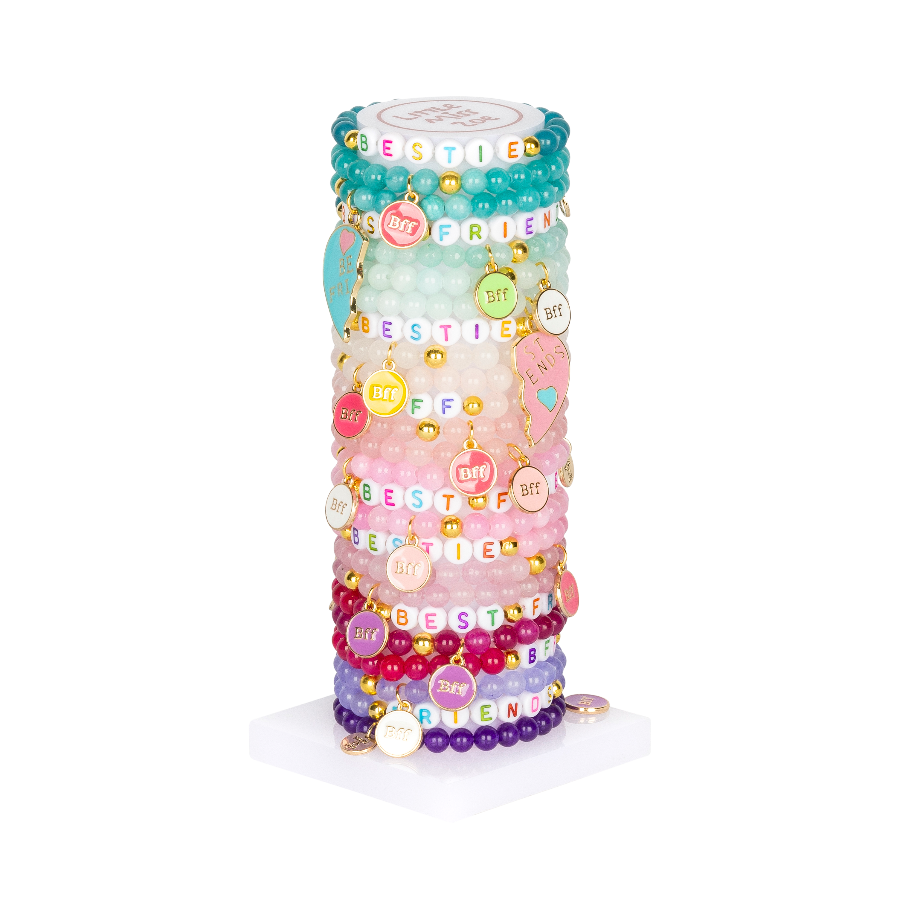 Bevat 25 verschillende kinderarmbanden met kralen en bedels in een grab & go armbandtoren, met kleurrijke Barbie-geïnspireerde ontwerpen en speelse, kindvriendelijke bedels. Elke armband is vooraf gestyled, verstelbaar en klaar om te dragen, waardoor deze toren perfect is voor kinderen en tieners. Little Miss Zoe's Armbandtoren is ontworpen voor boetieks die op zoek zijn naar een gemakkelijk te verkopen, boetiekklare kinderjuwelendisplay. Plaats de toren eenvoudig op een toonbank of plank en laat klanten hun favorieten kiezen — geen montage vereist. Waarom boetieks dol zijn op deze armbandtoren: - 25 verschillende armbanden met kralen en bedels - Grab & go juwelenbar – klaar voor verkoop & voorverpakt - Verstelbare maat – gemakkelijk passend voor kinderen - Kleurrijke, trendy ontwerpen die snel verkopen - Ideaal voor verjaardagsgeschenken, feestartikelen, schoencadeautjes en impulsaankopen - Gemaakt in de VS van de beste Amerikaanse en geïmporteerde materialen - Nikkel-, lood- en cadmiumvrij Perfect voor kinderjuwelendisplays, geschenksets voor kinderen, boetiekaccessoires en groothandel kinderjuwelencollecties. PRODUCTDETAILS - Toren bevat: 25 verschillende armbanden + 1 acryl armbanddisplay - Stijl: Armbanden met kralen en bedels - Maat: 6" verstelbaar - Materialen: Vergulde componenten; edelsteen, polymeer, siliconen en hars kralen; emaille, hars, acryl bedels en andere Leeftijdscategorie: 5+ Displaytype: Acryl armbandtoren / grab & go bar Kinderjuwelen, kinderarmband, armbandtoren, armbandbar, grab & go armbandbar, verstelbare kinderarmband, armband met kralen en bedels, vriendschapsarmband, kleurrijke kinderjuwelen, schattige kinderjuwelen, trendy kinderjuwelen, geschenkset voor kinderen, verjaardagsgeschenk, feestartikel, schoencadeautje, boetiekjuwelen, boetiekklaar, verkoopklare juwelen, groothandel kinderjuwelen, kinderaccessoires, tienerjuwelen toonbank juwelendisplay, gemakkelijk te verkopen kinderaccessoires.
