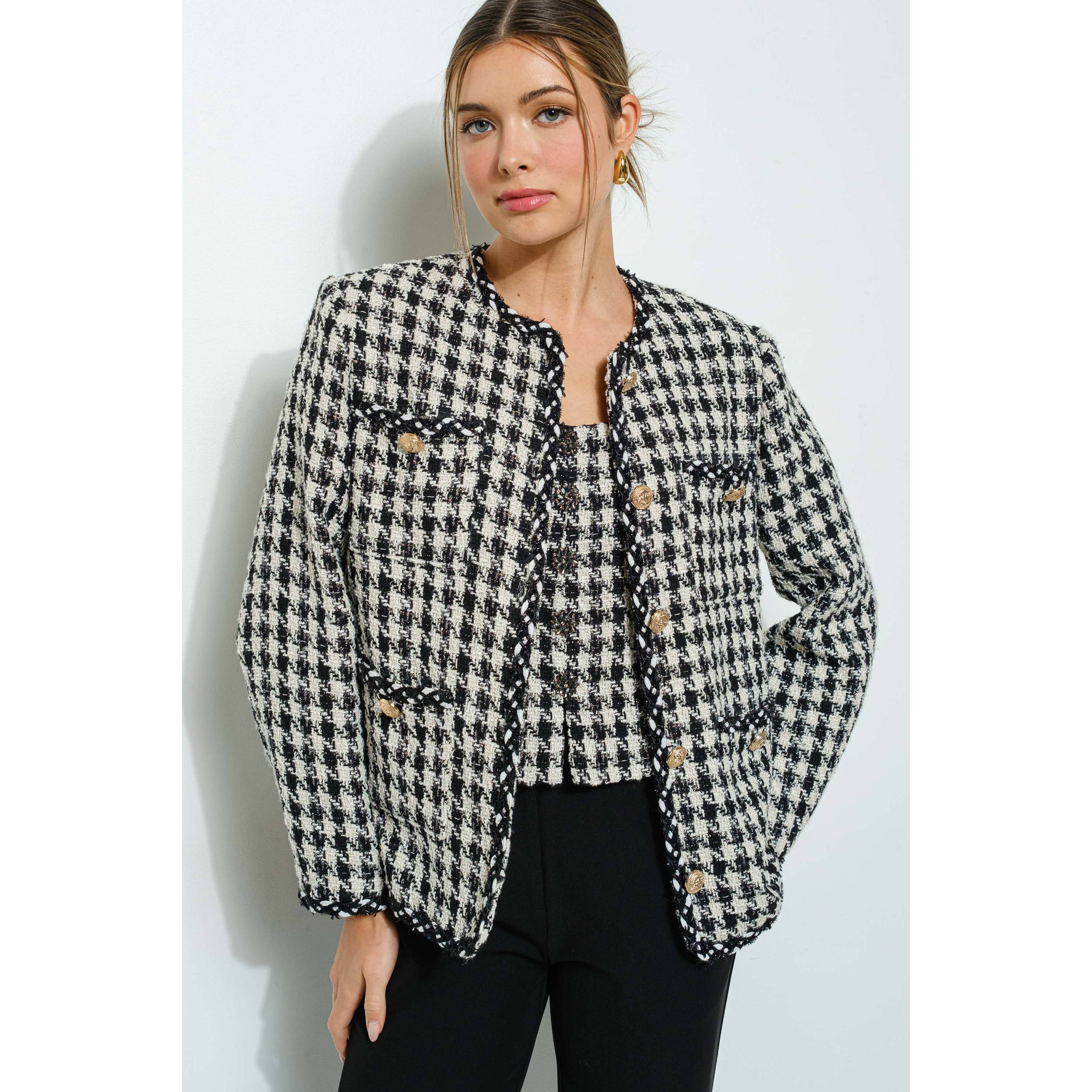 Tweed jasje met gevlochten afwerking en knoopsluiting - Getextureerd tweed jasje met gevlochten accenten voor een verfijnde uitstraling - Ronde halslijn en knoopsluiting aan de voorkant voor een tijdloze look - Decoratieve voorzakken met gevlochten details - Lange mouwen met een nette, gestructureerde pasvorm - Perfect te combineren met de bijpassende rok of op maat gemaakte broek - Ideaal voor kantoorlooks, semi-formele evenementen of chique weekenduitjes - Model is 1,77 m en draagt maat small