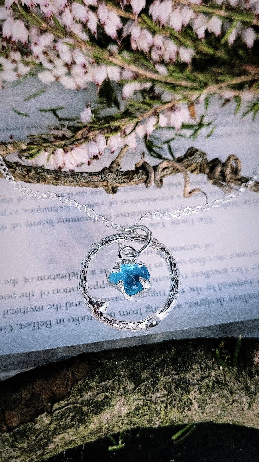 Een prachtige rustieke Faerie Ring, bezet met een 4mm blauwe topaas, op en 18 inch sterling zilveren Belcher Chain.