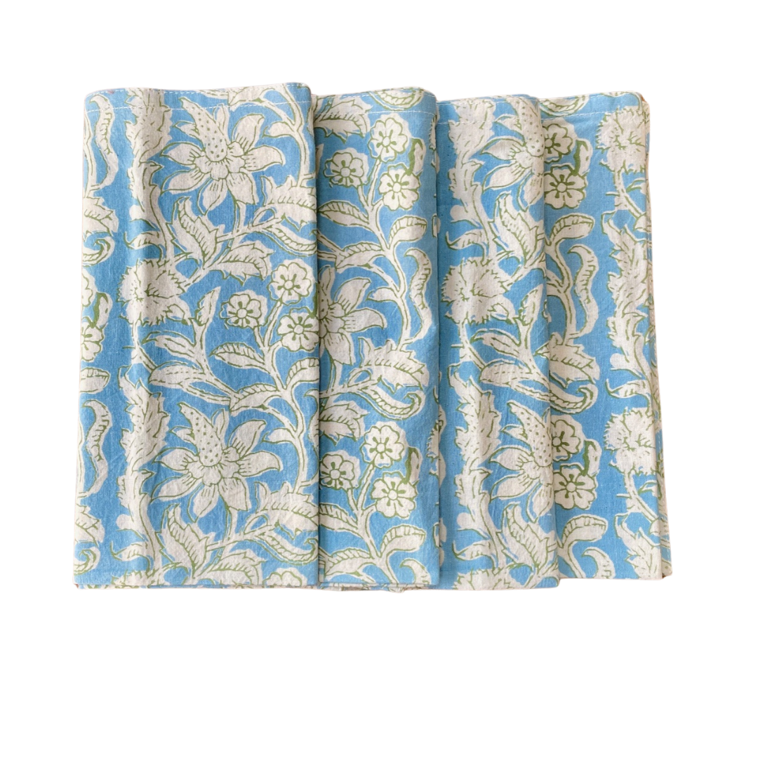 Prachtige sierlijke en exotische print op linnen. 20 x 20 linnen kussen gevoerd met fijne katoen. Verborgen ritssluiting. Vulling niet inbegrepen. Korenbloemblauw en mosgroen gedrukt op schelplinnen. Handgemaakt in India.