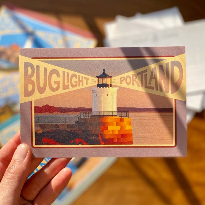 Maak een kusttour langs de iconische vuurtorens van Portland, Maine met deze unieke set wenskaarten. Een nautische kaarthemel benadrukt de kustlocatie van elke vuurtoren bij South Portland en Cape Elizabeth. Een perfect souvenir voor vuurtorenliefhebbers en kustenthousiastelingen. Inclusief: 1. Bug Light Park 2. Portland Head Light 3. Two Lights State Park 4. Spring Point Light 5. Ram Island Ledge Light Details: • Binnenkant blanco • A2 formaat (10,8 cm x 14 cm) • Gedrukt op zwaar mat karton • Inclusief witte envelop • Samen verpakt in een buikband met plastic hoesjes • Logo, website en Instagram-informatie op de achterkant Ontworpen & Verpakt in Maine