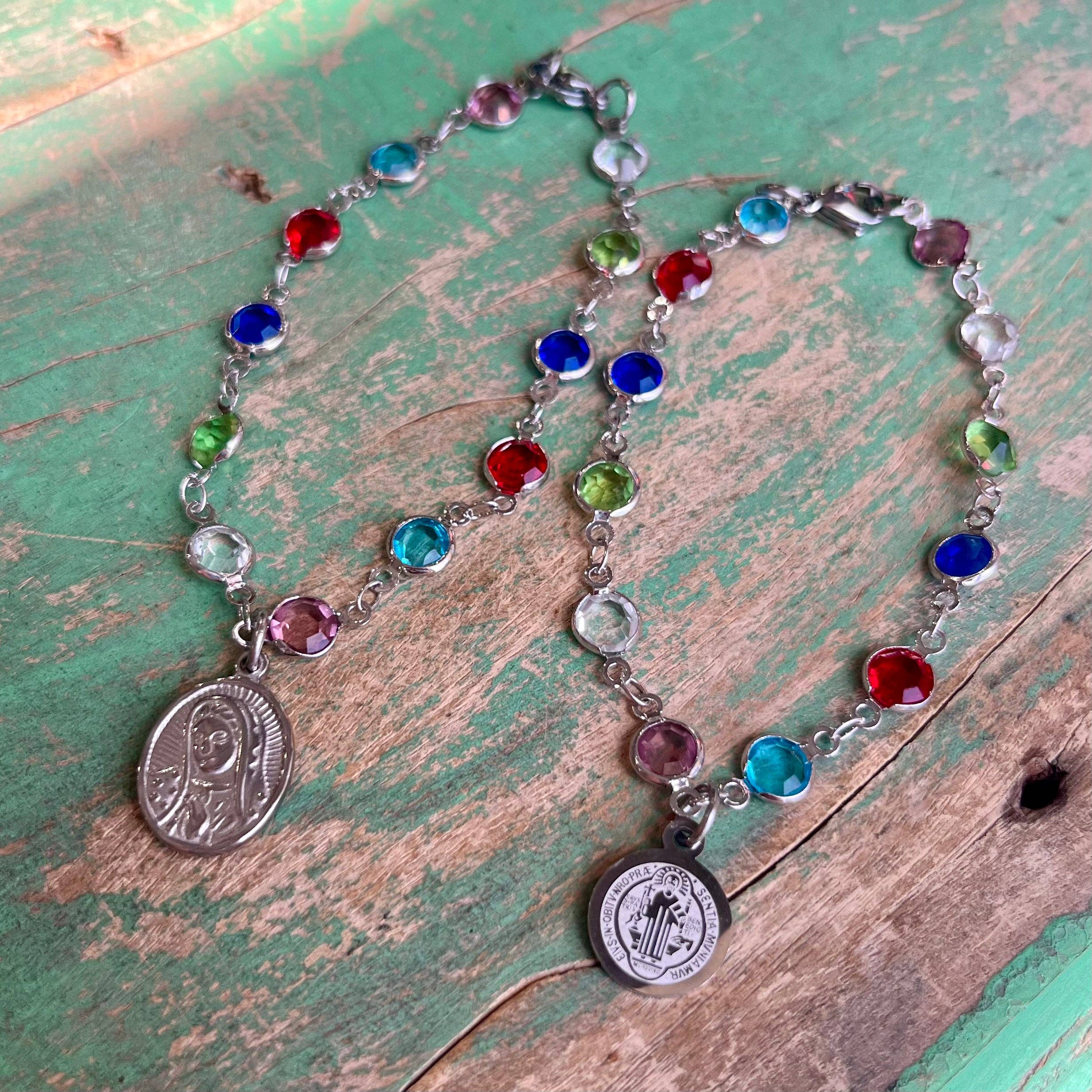 Medailles met zilverkleurige plating. Kies uit een ring met verschillende heiligen, de Miraculous Medal (MM) met heiligen, of Onze-Lieve-Vrouw van Guadalupe (OLG) met verschillende heiligen in het midden. Verstelbare lengte van 68,6 tot 76,2 cm (27"-30").