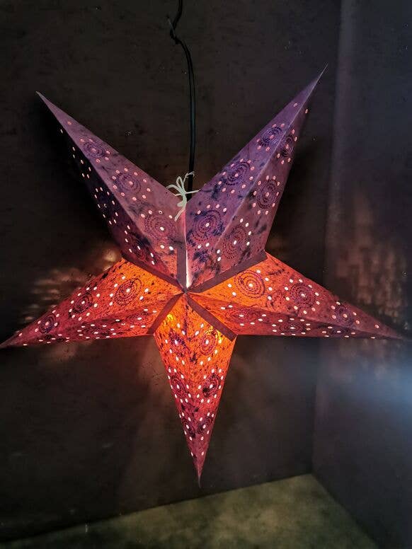 Onze StarLights worden met de hand gemaakt in India door partners van de Om Gallery. Ze zijn verkrijgbaar in vele schitterende patronen. Gemaakt van 100% gerecyclede materialen, creëren deze hangende lantaarns sfeer en een slimme accentverlichting. "Creëer je Om"! Afmetingen: 24" x 24" x 8" Inclusief een 12' UL goedgekeurde verlichtingsset.