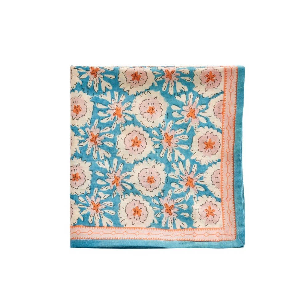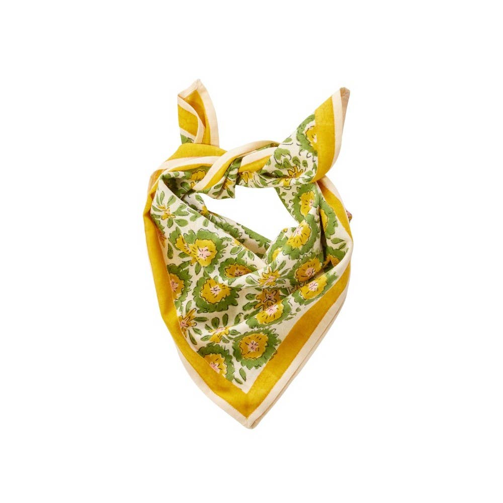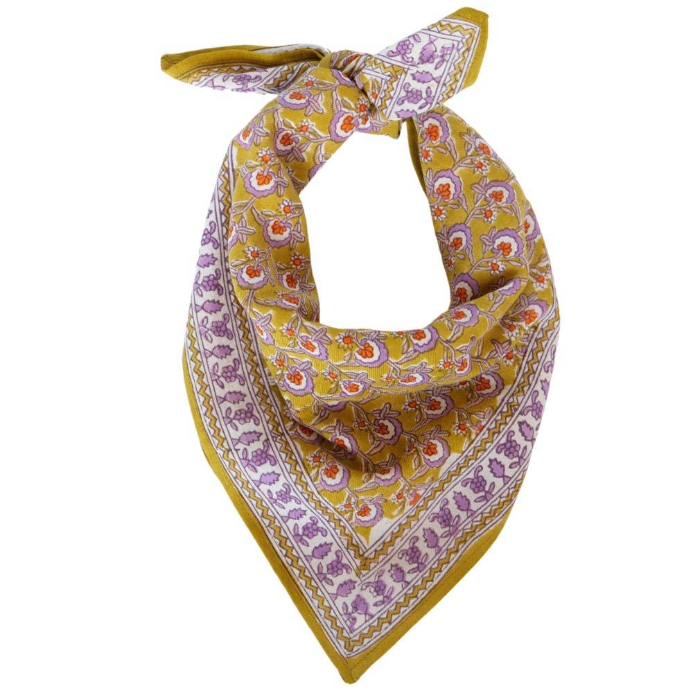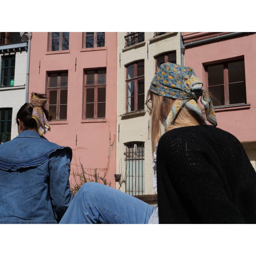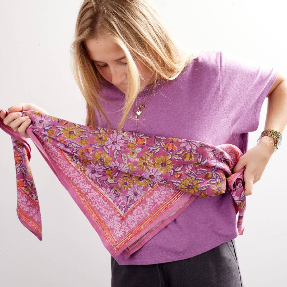 Het ultieme bohemien accessoire, om te dragen, te hergebruiken, te schenken... Exclusieve print ontworpen door Bonheur du Jour Met de hand gemaakt volgens de traditionele blockprint-techniek Gemaakt van 100% zacht katoen voor een vloeiende en natuurlijke val Onderhoud: wassen op 30° in een fijnwasprogramma, met gelijke kleuren, strijken op lage temperatuur en zacht drogen aanbevolen