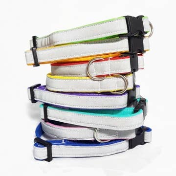 Met 12 kleuropties en met de hand geselecteerd lint, zijn deze effen halsbanden zowel mooi als veelzijdig. Draag er een op zichzelf voor een ontspannen look of combineer met een vlinderdas of corsage en je bent direct klaar voor een avondje uit. ***Vermelding is voor 1 halsband in de kleur van uw keuze. Geef de gewenste kleur aan in het keuzemenu. Alle halsbanden hebben veiligheidssluitingen voor de veiligheid van katten. Niet te gebruiken met een riem. Maten: Kitten past om nekken van 5-8" Standaard past om nekken van 7-10" Leeuw past om nekken van 9-12" Al onze halsbanden worden met liefde met de hand gemaakt in Portland, Oregon. Alle halsbanden zijn gemaakt van hoogwaardig webbing voor duurzaamheid, bedekt met met de hand geselecteerd lint of stof. We dubbelstikken stresspunten; waardoor onze halsbanden zowel stevig als prachtig zijn. Let op dat elke halsband op maat wordt gemaakt en het stofpatroon kan variëren.