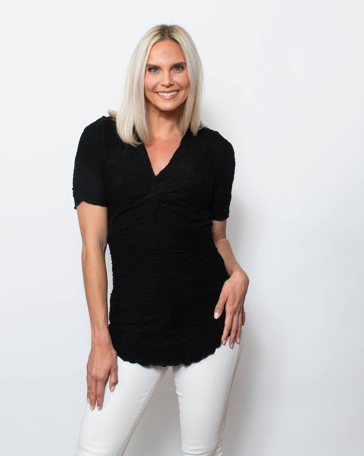 Twipsluiting aan de voorkant met korte mouwen en striksluiting, hemdstaartzoom.