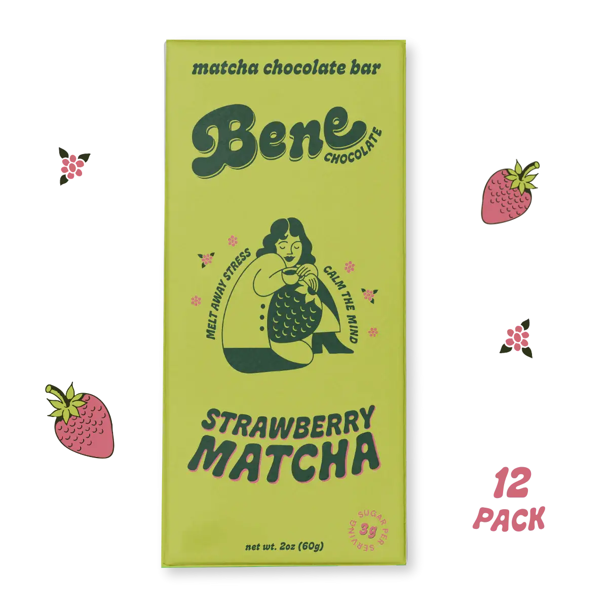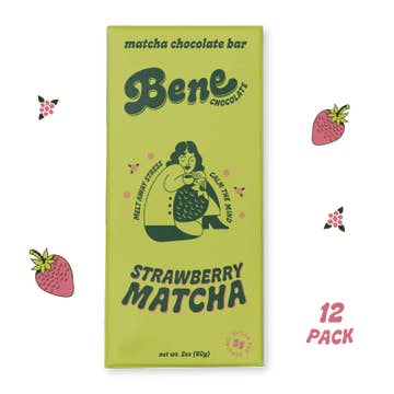 AARDBEI MATCHA | Bene Chocolate (*Nieuwe merkidentiteit, dezelfde heerlijke chocolade!*) Matcha Chocoladereep (60g) - 12 PAK *voor meer aanwezigheid en gemoedsrust* Versterkt met adaptogenen om stress weg te smelten en angstige gedachten te verlichten, waardoor je in het huidige moment komt met een kalme gemoedstoestand en een grotere emotionele balans. Elke hap roept de bevredigende smaak op van je favoriete matcha latte, bestrooid met zomerse zoete aardbeien. Elk romig latte-hapje is een stressverlichter, focusbooster, alfa-hersengolfinductor en een heerlijk kalmerende traktatie. Gemaakt met biologische ingrediënten en geformuleerd om suikerarm, zuivelvrij, veganistisch en glutenvrij te zijn. Een Betere Manier om Jezelf te Verwennen ™ Natuurlijk gezoet met 2-3g suiker per portie en plantaardig, zijn deze nieuwe repen onmiskenbaar heerlijk en verrijkt met een eenvoudige, perfect uitgebalanceerde mix van actieve superfoods en adaptogenen. VOORDELEN: 😌 Minder Stress + Verhoog Focus 🌿 Versterkt met adaptogenen Ashwagandha + L-Theanine 🌀 Bevordert een kalme, gefocuste mindset 💆 ♀️ Verminder zorgelijke gedachten ⚖️ Verlaag stresshormoon, cortisol 🌟 Verhoog GABA 🧠 Verhoog Alfa Hersengolven voor meer creativiteit 🌱 100% Vegan & Biologische Ingrediënten