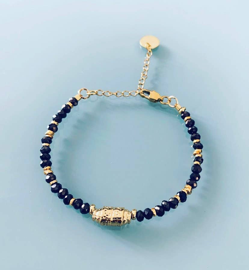 Deze damesarmband met amulet en parels bevat een magische talisman en 24k goud vergulde Heishi kralen. De ketting is bevestigd met een karabijnsluiting en past perfect om je pols dankzij de verstelbare ketting. De armband is bezet met natuurlijke stenen en Heishi kralen verguld met 24k fijn goud. Het amulet is verguld met 3 micron fijn goud. De armband is waterbestendig, maar het wordt aanbevolen deze na contact met water te drogen en contact met schoonmaakmiddelen te vermijden om de levensduur te verlengen.