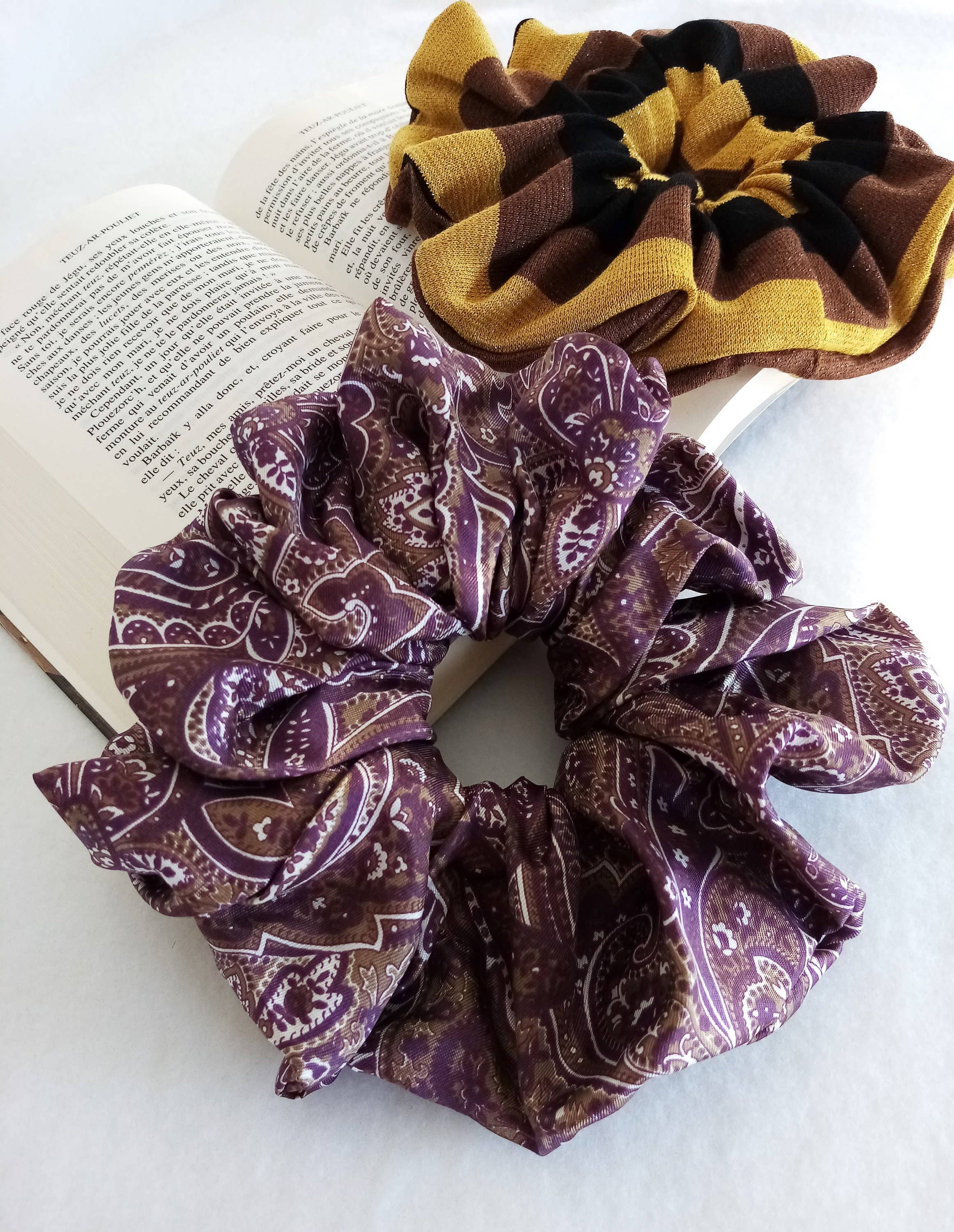 Productnaam - XXL viscose scrunchie met bloemen en gouden draad donkergeel - AURORE Donkergele XXL tailleelastische scrunchie met blauwe bloempatronen en gouden viscosedraad. Het zal je broodjes, vlechten en paardenstaarten verrukken... en kan ook om de pols worden gedragen om je stijl een kleurrijk tintje te geven! * Stoffen scrunchies hebben de bijzonderheid dat ze je haar niet beschadigen of breken, in tegenstelling tot klassieke elastieken. Ze markeren het haar ook minder als je het vastbindt. * Al mijn scrunchies zijn verkrijgbaar in XXL- en standaardmaten (zie winkel). De totale diameter van de XXL is 20 cm. Je kunt 2 beurten doen, afhankelijk van de dikte van je haar. GEEN DOORGANG IN DE MACHINE/DROGER.. ALLEEN HANDWAS!