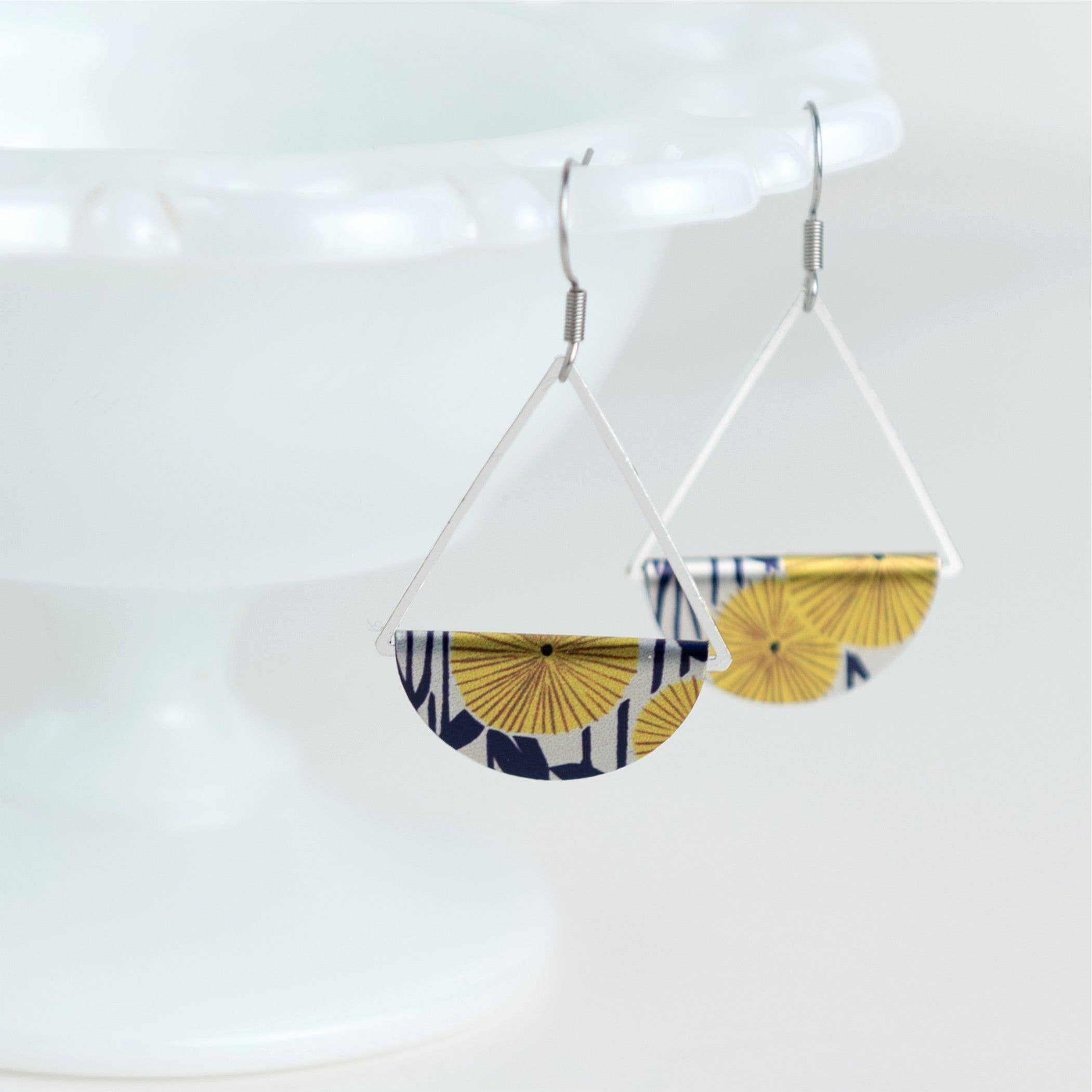 Onze lichte en comfortabele oorbellen zijn gemaakt met een patroon dat in aluminium is verwerkt, wat zorgt voor een duurzame en hypoallergene afwerking. Elk paar heeft een schijf van 1" die om een driehoek van 1" is gewikkeld, wat resulteert in een totale lengte van 2". De chirurgische roestvrijstalen haakjes zijn veilig voor iedereen, hypoallergeen, nikkelvrij en perfect voor de gevoelige huid. Milieuvriendelijk: gerecycled trofee-aluminium. Trots handgemaakt in Canada! Niagara Falls, Ontario.