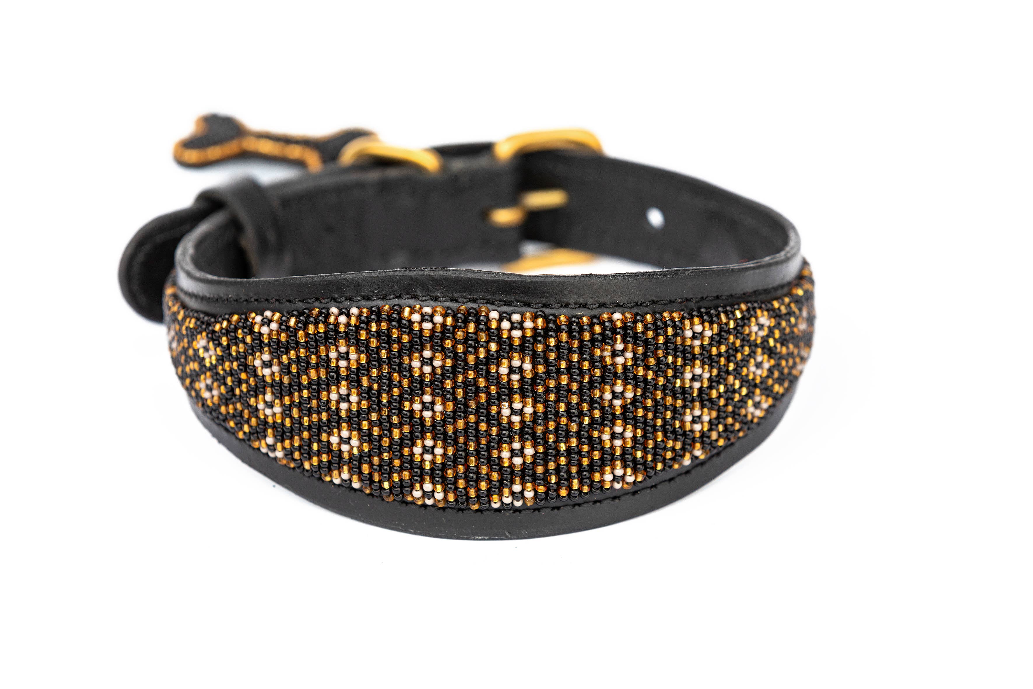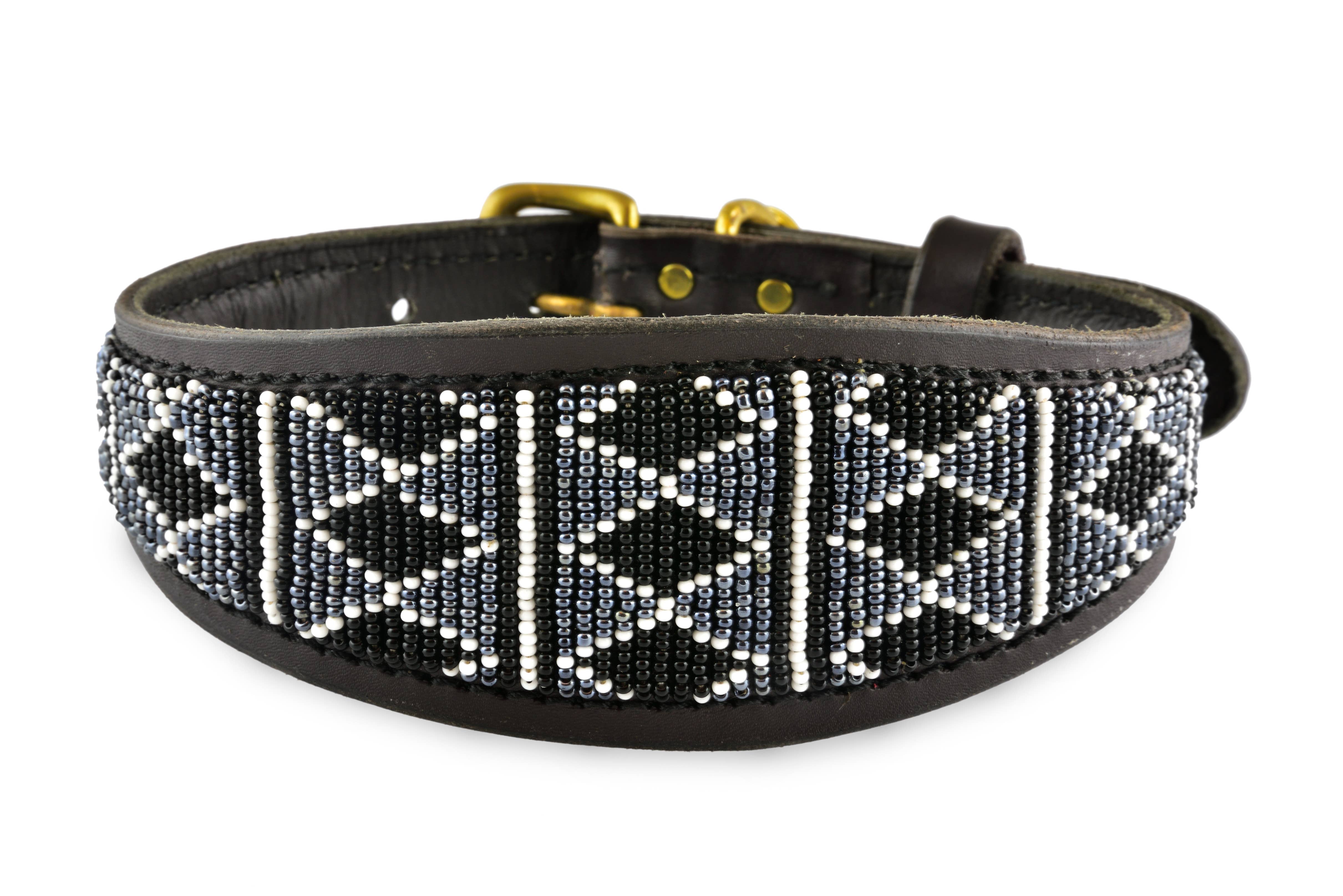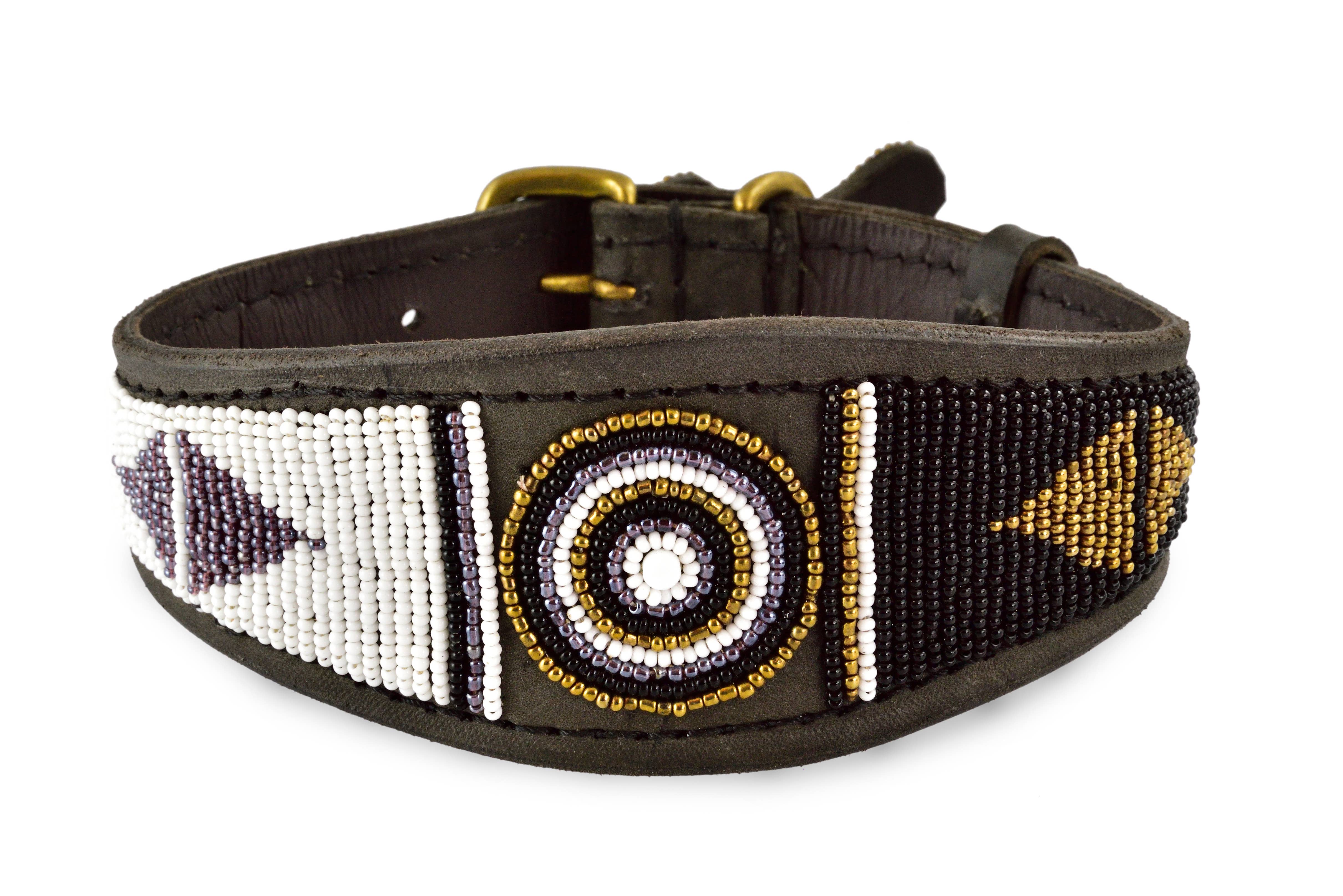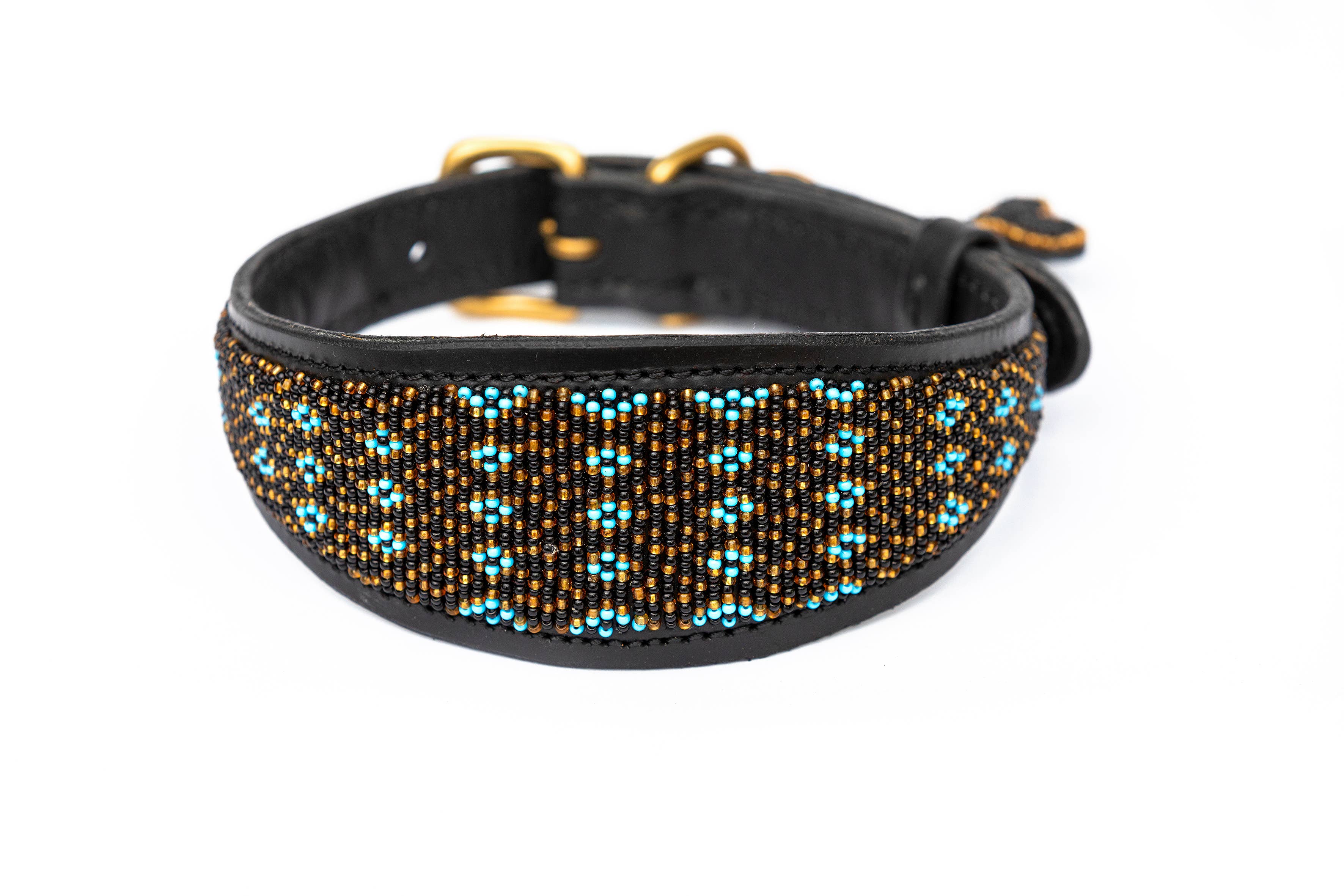 Deze lucherhalsband is gemaakt van natuurlijk Keniaans rundleer dat plantaardig is gelooid om zowel duurzaam als milieuvriendelijk te zijn. De binnenkant is gevoerd met zacht, plantaardig gelooid geitenleer voor extra comfort. De elegante kleurencombinatie van turquoise, zwart en goud creëert een prachtige uitstraling. De messing details zijn met de hand vervaardigd door lokale ambachtslieden die gerecycled messing gebruiken. De halsband is prachtig versierd met 100% glazen kralen, met de hand geregen en met de hand gestikt voor extra duurzaamheid en langdurige schoonheid. Als extraatje is er een kralen sleutelhanger met een bijpassend, contrasterend patroon inbegrepen. Verkrijgbaar in maten variërend van mini tot groot. Wanneer je een halsband van Zinj Design koopt, ontvang je niet alleen een uniek en prachtig product. Handgemaakte producten met menselijkheid en liefde.