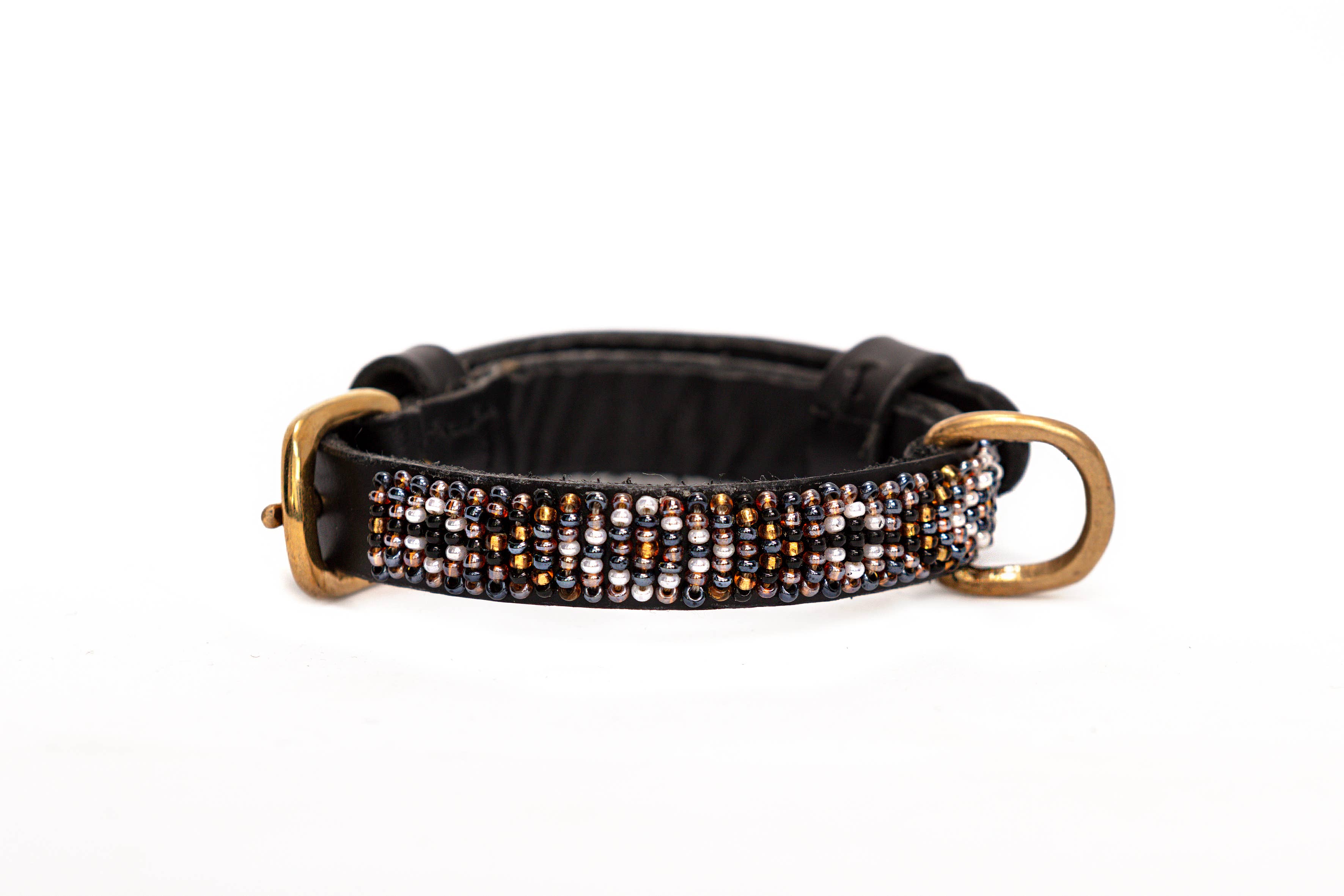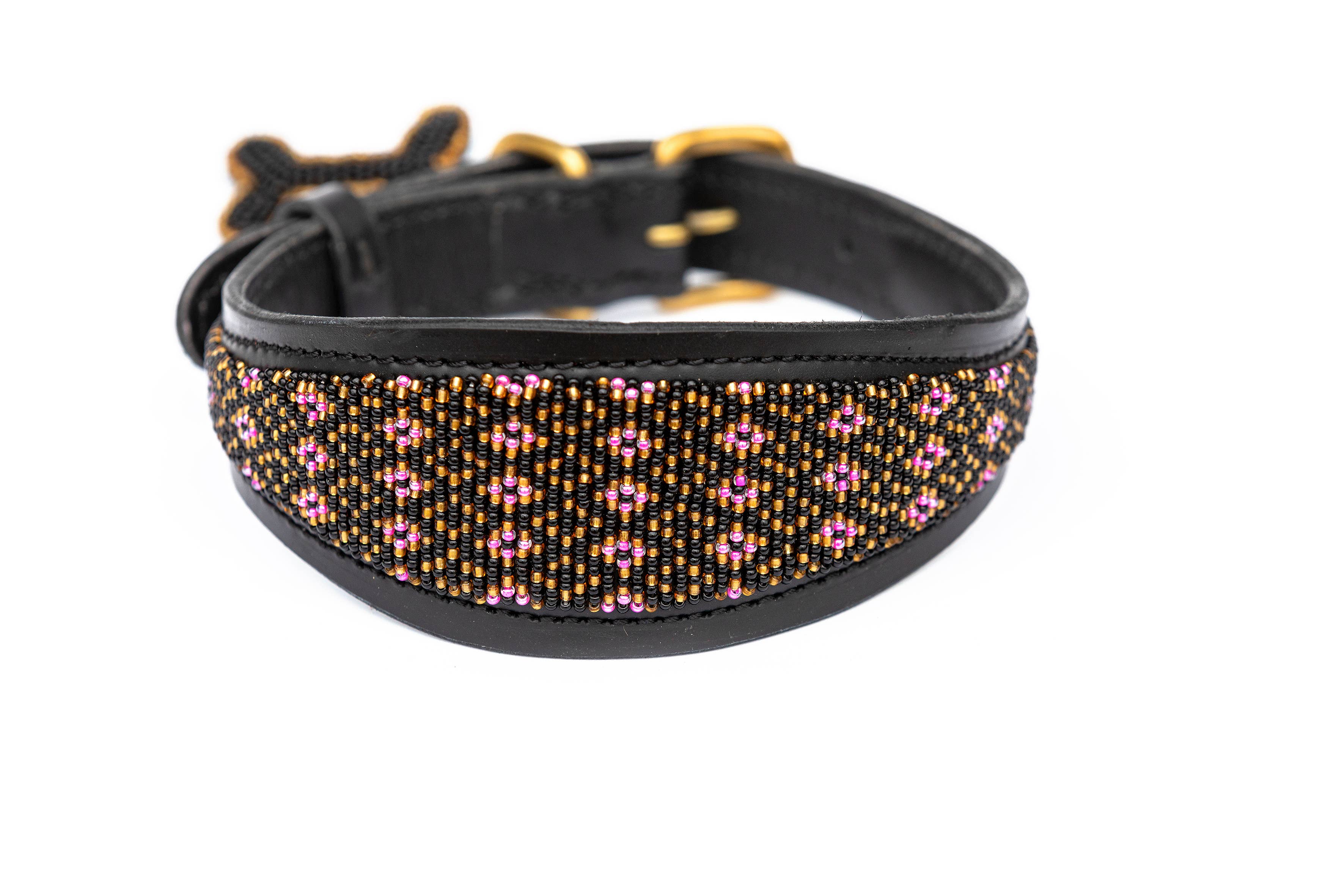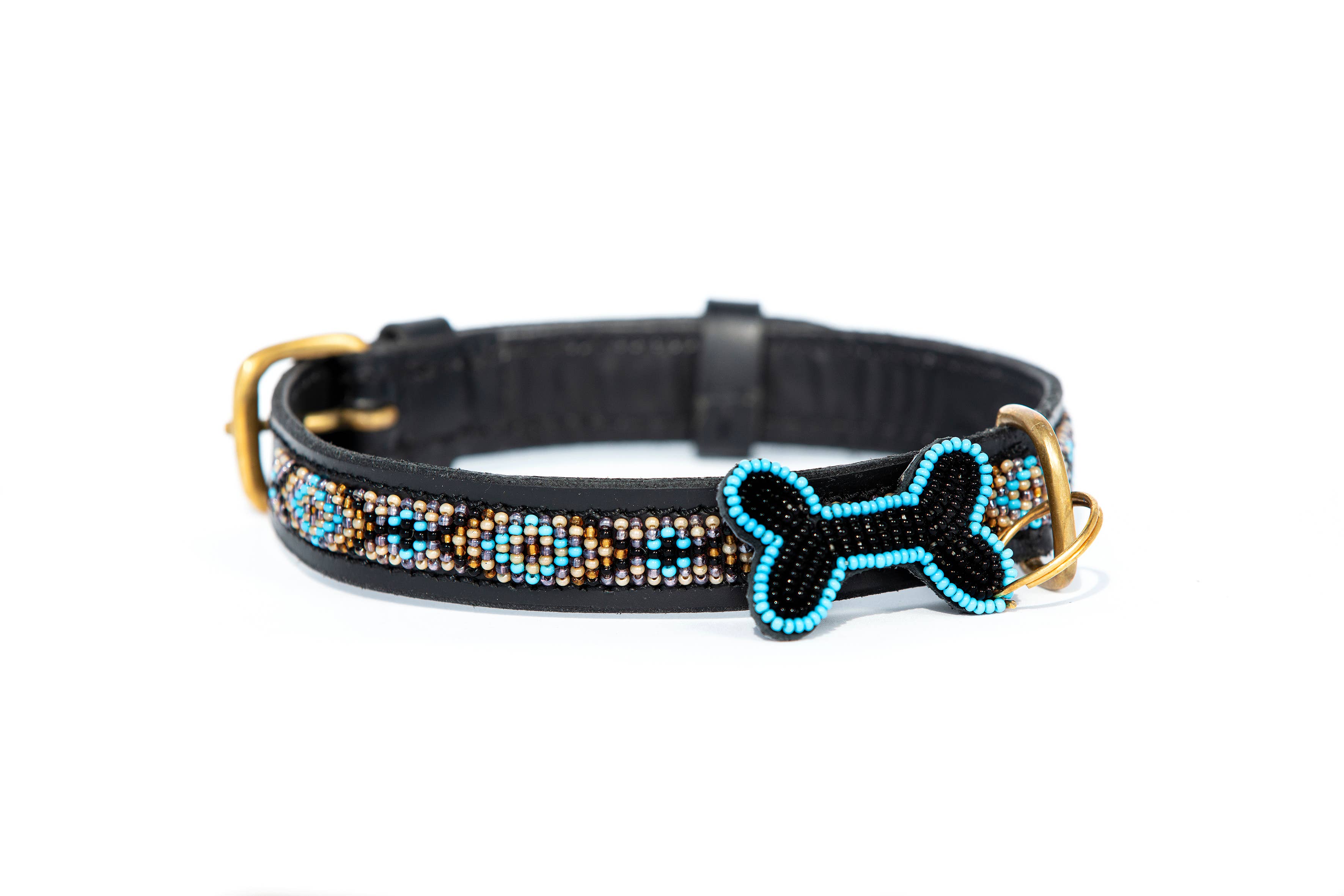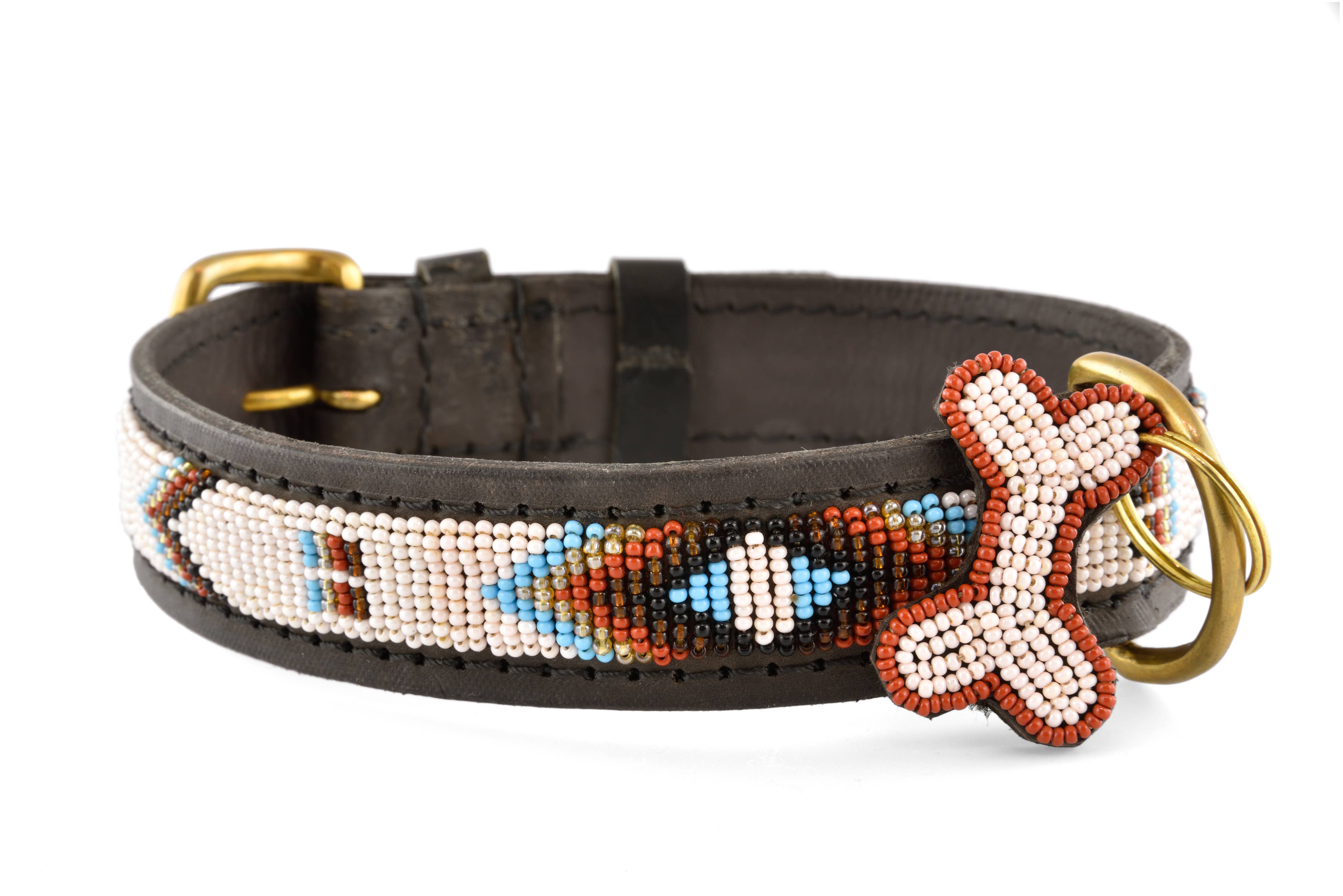 Deze lucherhalsband is gemaakt van natuurlijk Keniaans rundleer dat plantaardig is gelooid om zowel duurzaam als milieuvriendelijk te zijn. De binnenkant is gevoerd met zacht, plantaardig gelooid geitenleer voor extra comfort. De elegante kleurencombinatie van turquoise, zwart en goud creëert een prachtige uitstraling. De messing details zijn met de hand vervaardigd door lokale ambachtslieden die gerecycled messing gebruiken. De halsband is prachtig versierd met 100% glazen kralen, met de hand geregen en met de hand gestikt voor extra duurzaamheid en langdurige schoonheid. Als extraatje is er een kralen sleutelhanger met een bijpassend, contrasterend patroon inbegrepen. Verkrijgbaar in maten variërend van mini tot groot. Wanneer je een halsband van Zinj Design koopt, ontvang je niet alleen een uniek en prachtig product. Handgemaakte producten met menselijkheid en liefde.