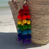 Prachtige pompon tasbedel in de kleuren van de regenboog op een slimme en stevige glanzende messing clipbevestiging. In totaal 42 pompons met een diameter van 2,5 cm. Totale lengte inclusief clip 31 cm. Palmbladmarktmand apart verkocht bij PomPom Galore!