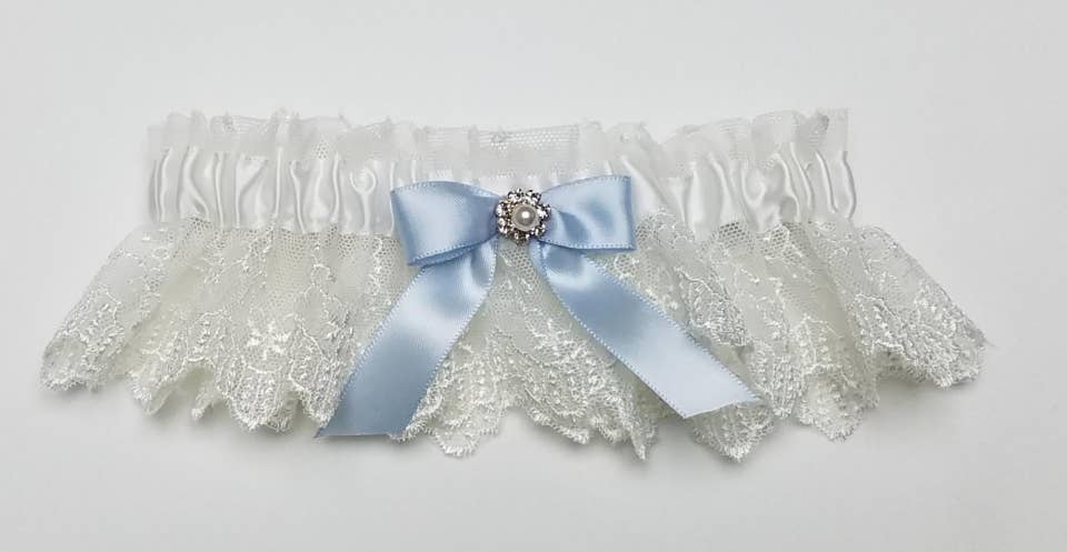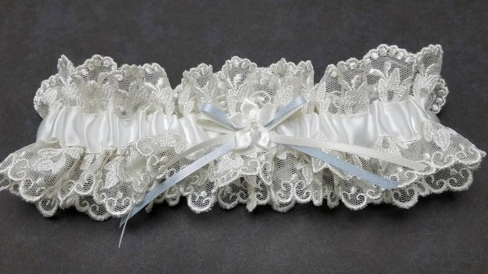 Een geborduurde kanten kousenband met een lichtblauwe of antiekwitte band.