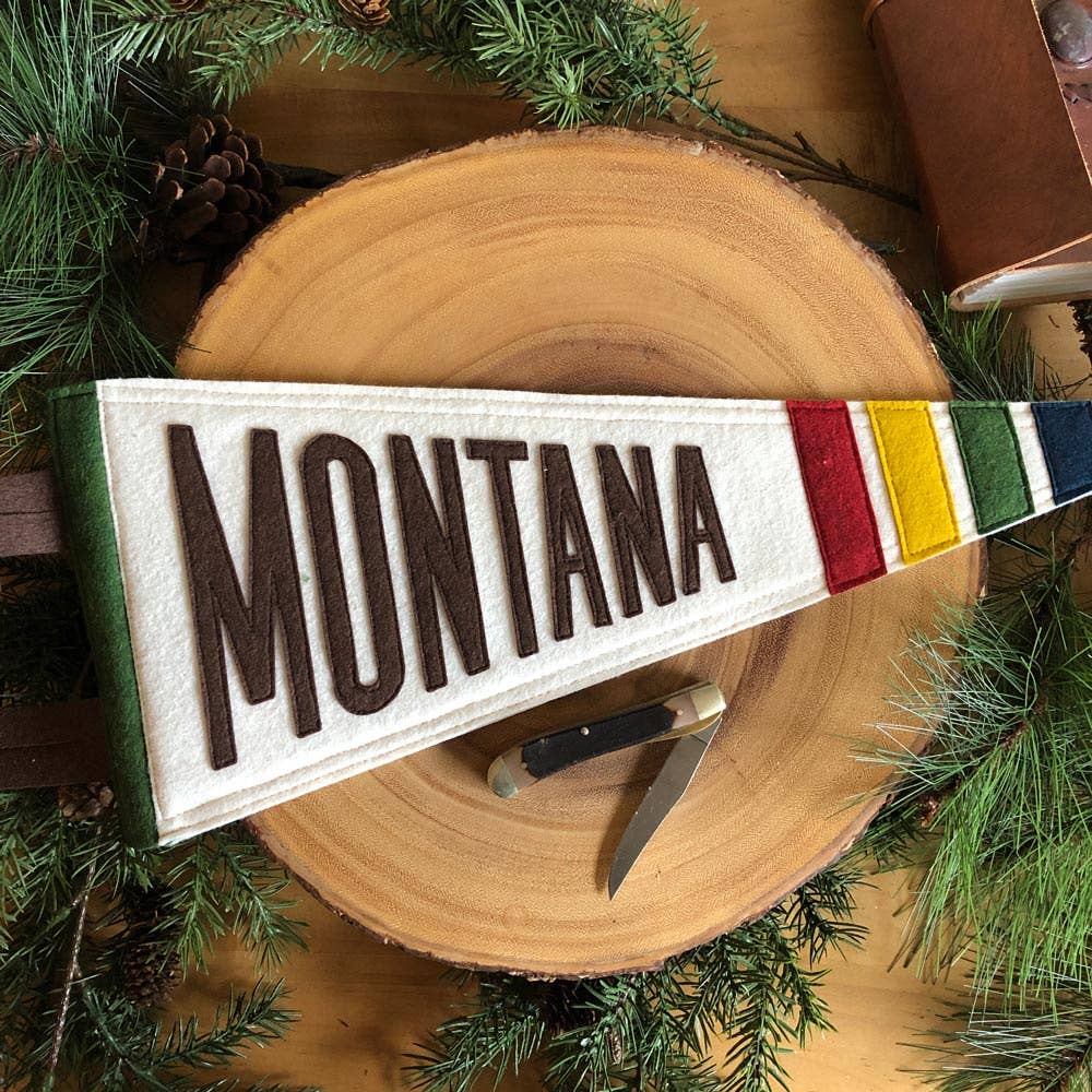 BEPERKTE EDITIE Ter ere van de geweldige staat Montana toont onze 1889 wimpel de iconische vlaktes en Amerikaanse bizons van deze prachtige staat. Volledig gestikt in Alberta met Massachusetts wolvilt door Yoho & Co. Designer Pennants. Geschatte afmeting: 48 cm x 19 cm