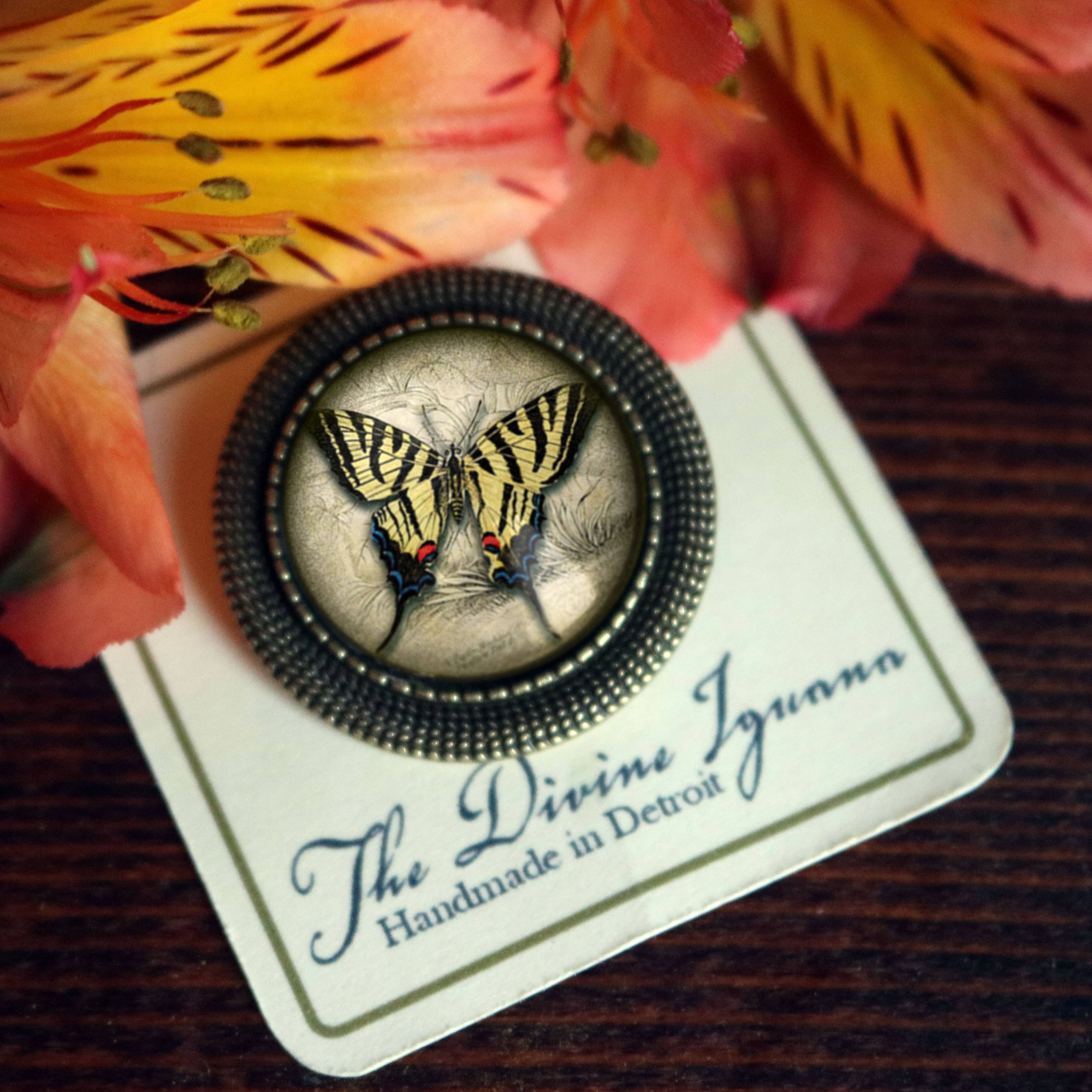 Eenvoudige broche met vintage uitstraling en bronzen montuur. De broche is 3,18 cm breed. Het afbeeldingengedeelte is 1,9 cm groot (ongeveer ter grootte van een kwart). Handgemaakt in een thuiskantoor in Detroit, MI. De broches worden geleverd in een kartonnen doosje van 5 x 5 cm met het logo van The Divine Iguana. Wilt u liever dat uw broches los worden geleverd, laat het ons dan weten.