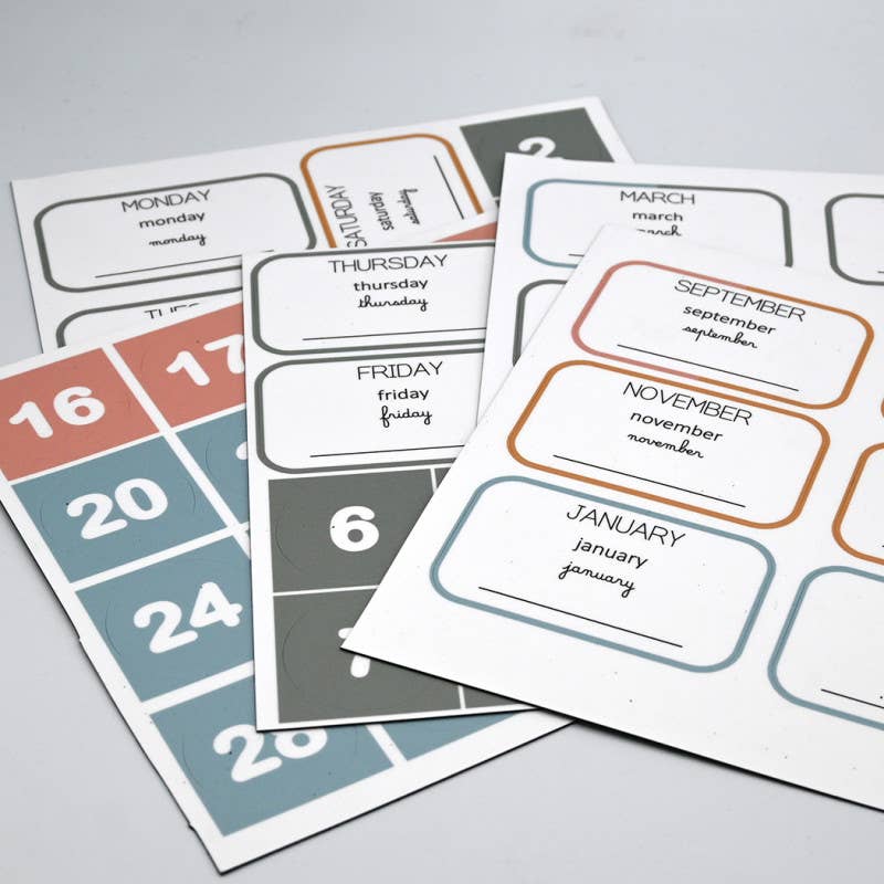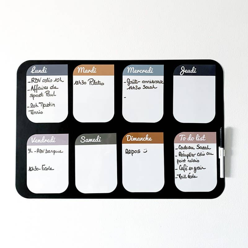 De magnetische wandkalender is handig en decoratief en biedt levensgrote displayruimte. DE FERFLEX® MAGNETISCHE KALENDERKIT BEVAT: 1 magnetische kalender bestaande uit 35 magnetische vierkanten van 13x13 cm, een rechthoekig „memobord” van 67 cm x 25 cm (HxL) en een magnetische lijn van 60x7,5 cm om de maand en het jaar op te schrijven. Dikte 0,6 mm 1 set witte magnetische cijfers en letters - 142 stuks om de datums van de dagen van de week weer te geven 38 plaknotities: 5 gekleurde magnetische plaknotities van 8x8cm (pastelkleuren), 5 witte magnetische plaknotities van 8x8cm, 5 witte magnetische plaknotities van 6,5x4,5 cm, 10 gekleurde magnetische plaknotities van 6,5x4,5 cm (pastelkleuren), 4 witte magnetische plaknotities van 2,2x8,5 cm (pastelkleuren) 1 zwarte, droog uitwisbare stift en de magnetische markerhouder 6 zilveren magneten (afmeting 6 x 10 mm). Discrete maar krachtige magneten Ref: Kinderspellen/Educatief spel/Cadeau voor kinderen
