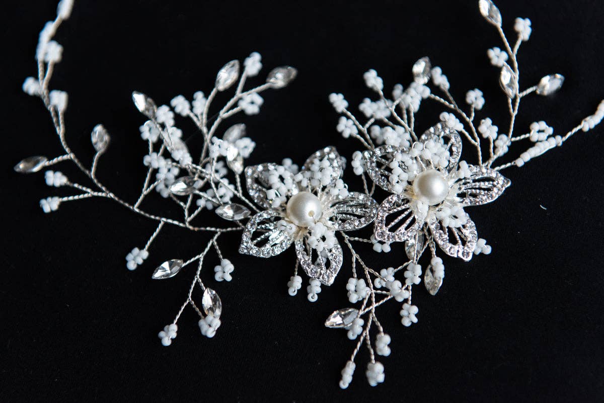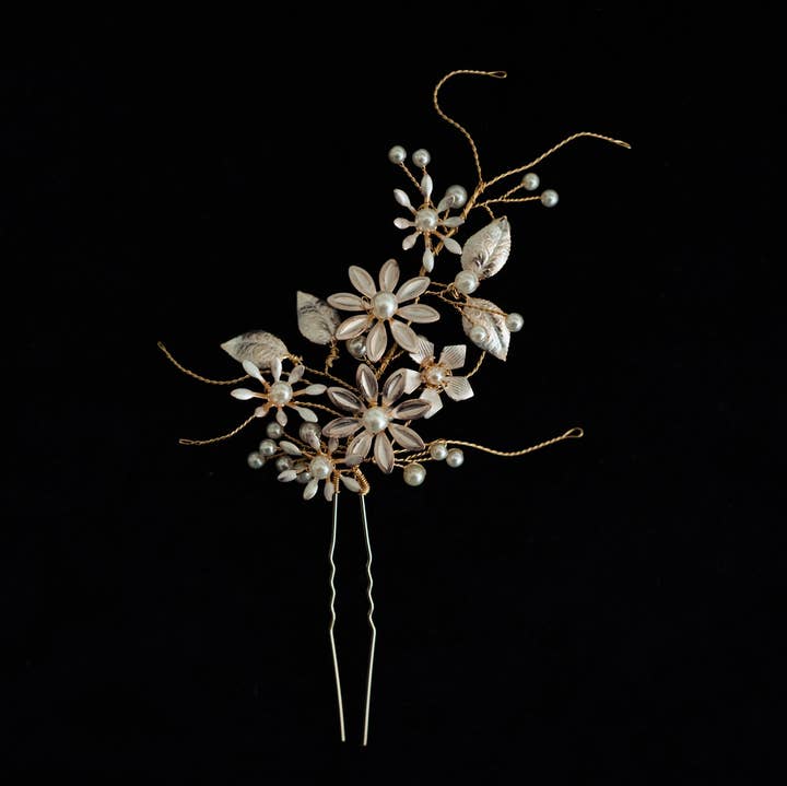 Geen bruidslook is compleet zonder een vleugje glamour! Dit prachtige handgemaakte haarsieraad is de perfecte aanvulling op je trouwdag! De haarspeld van Esther is handgemaakt met een bladgoudmotief. Zet 2-3 bij elkaar om een mooi brandpunt te creëren. Dit gouden haarsieraad is een prachtige toevoeging van bling en glamour aan je haar op je trouwdag! Koop de volledige bijpassende set (7 stuks) voor je bruidsmeisjes, ouders, tantes of bloemenmeisje en bespaar $60! — Materiaal: kralen, haarspeld. — Wij zijn een moeder- en dochterduo die beiden een gecombineerde ervaring hebben van meer dan 35 jaar in de bruiloftsbranche! Van bruidsaanpassingen tot het opnieuw ontwerpen van vintage jurken uit de jaren 60 tot trouwfotografie - bruiloften en mode zijn altijd een groot deel van ons leven geweest!