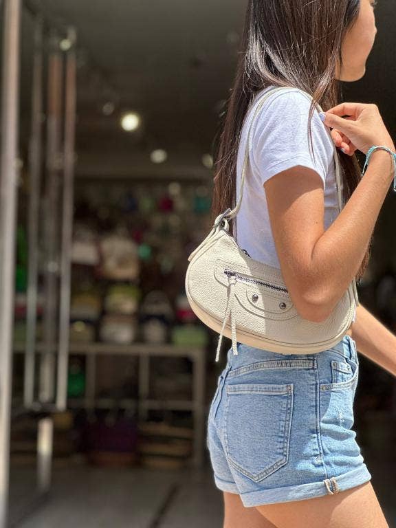 Italiaanse leren damestas met decoratief voorpaneel, voorzien van 2 korte handvatten en een verstelbare en afneembare schouderriem. Materiaal: leer. Sluiting: rits. Binnenkant: gevoerd, met een zijvak voor kleine items zoals sleutels of munten en een vak aan de andere kant met ritssluiting. Afmetingen (L x B x H): 25 x 12 x 19 cm. Bodem: vlak met studs. Gemaakt in Italië.
